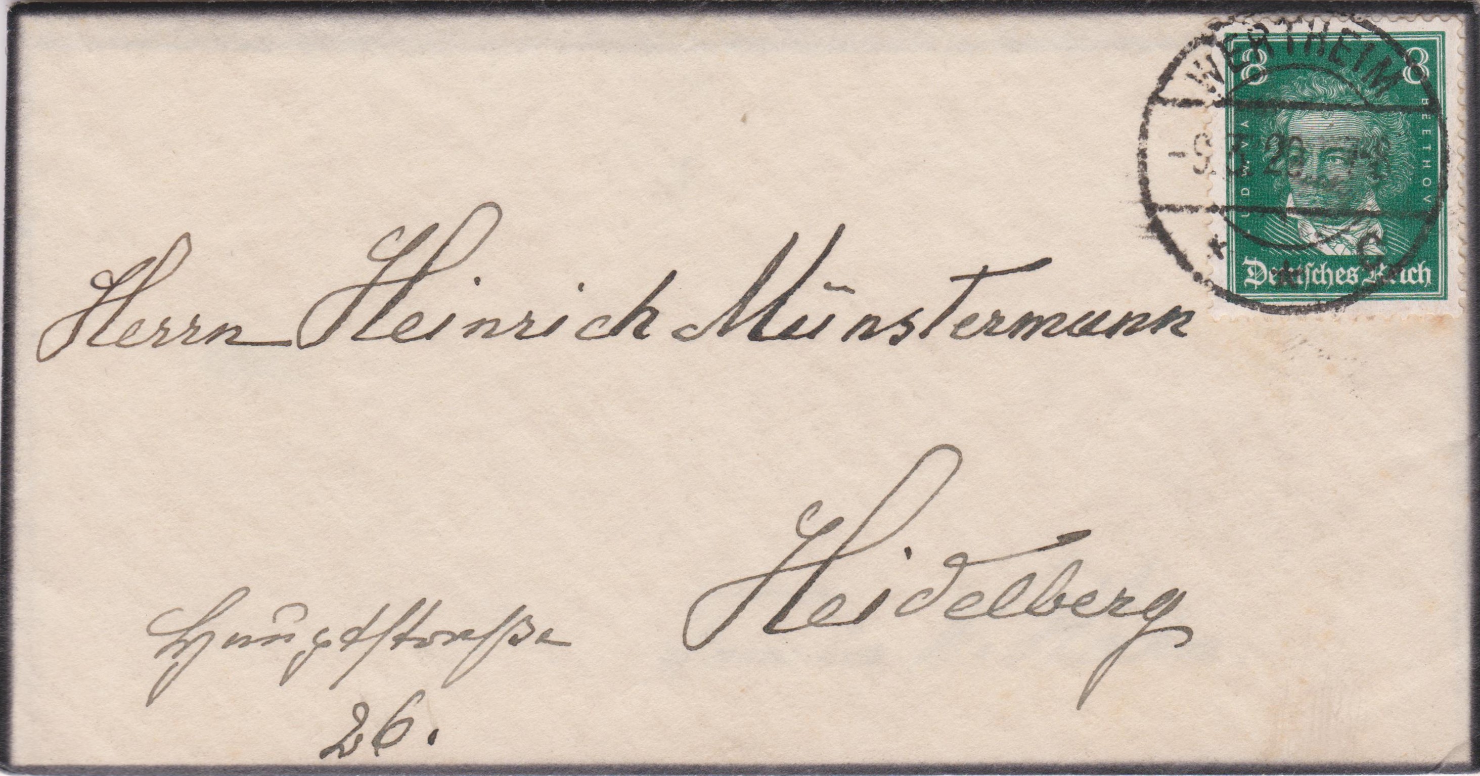 Kleiner Trauerbrief, am 09.03.1929 frankiert mit 8 Pf gelaufen von WERTHEIM nach Heidelberg: