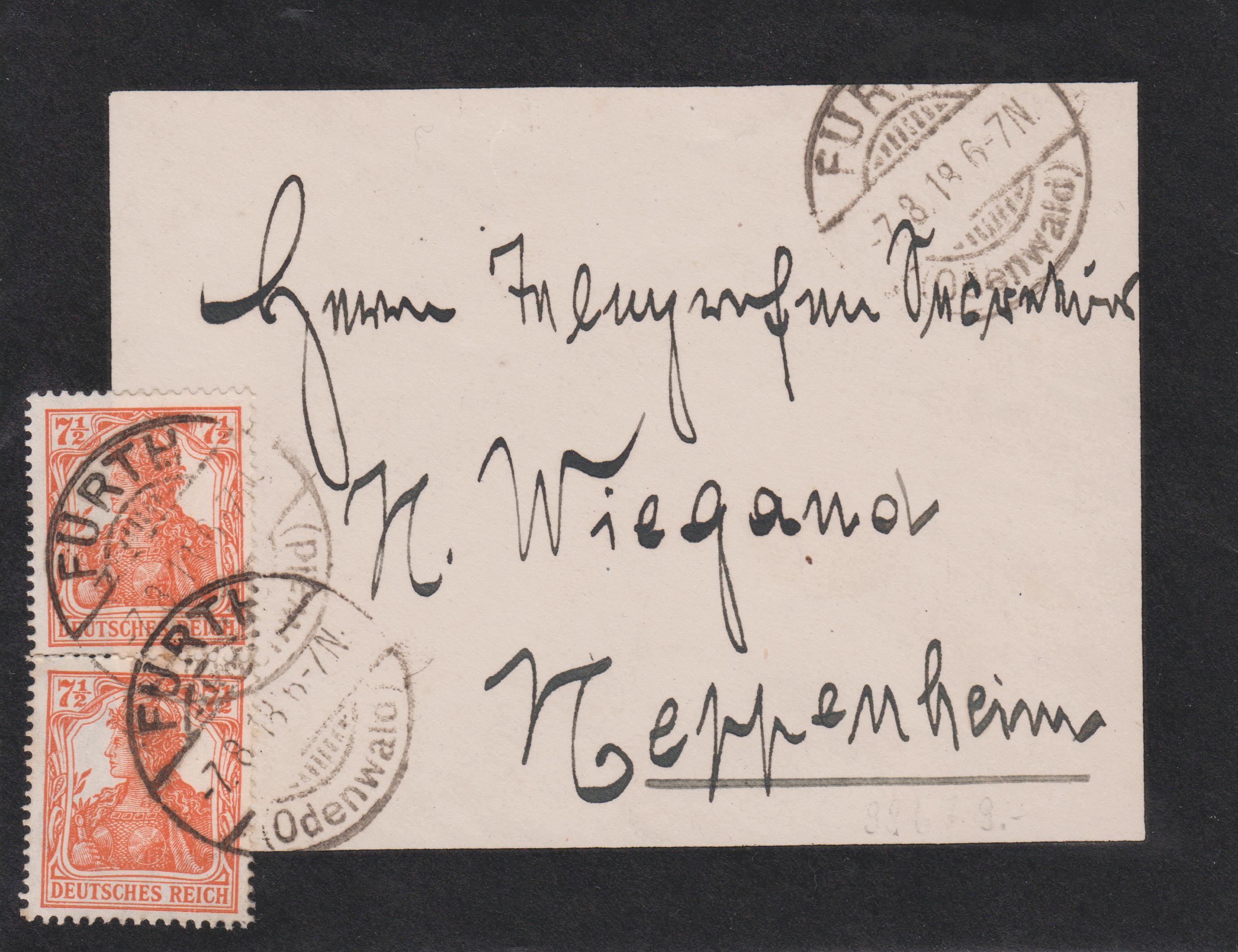 Trauerbrief, am 07.08.1918 als Brief im Fernverkehr bis 20 g portogerecht frankiert mit 15 Pf in Form einer Mehrfachfrankatur von zwei Postwertzeichen der Wertstufe 71/2 Pf der Dauerserie Germania: