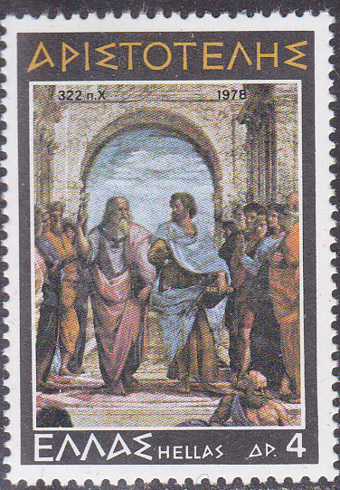 Zum 2300. Todestag von Aristoteles ist in Griechenland in einer Serie diese Marke (MiNr 1316) mit einer Büste von Aristoteles erschienen.