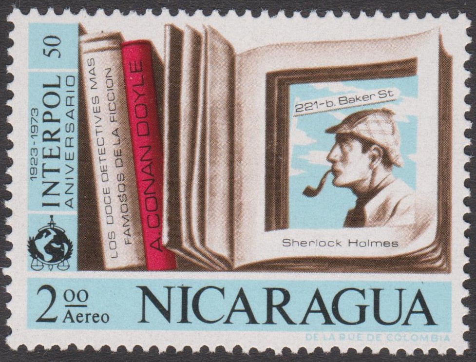 Dieses Postwertzeichen aus Nicaragua würdigt Sherlock Homes im Rahmen eines Satzes zum Thema Interpol: