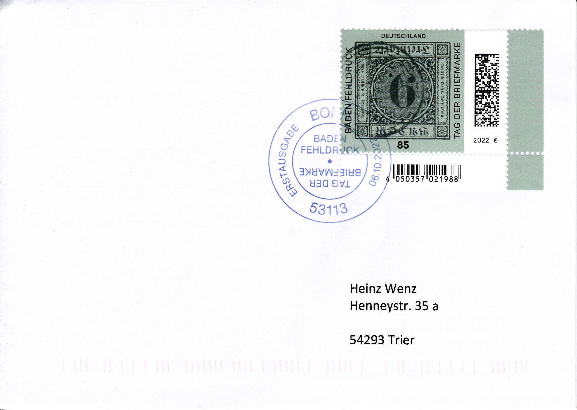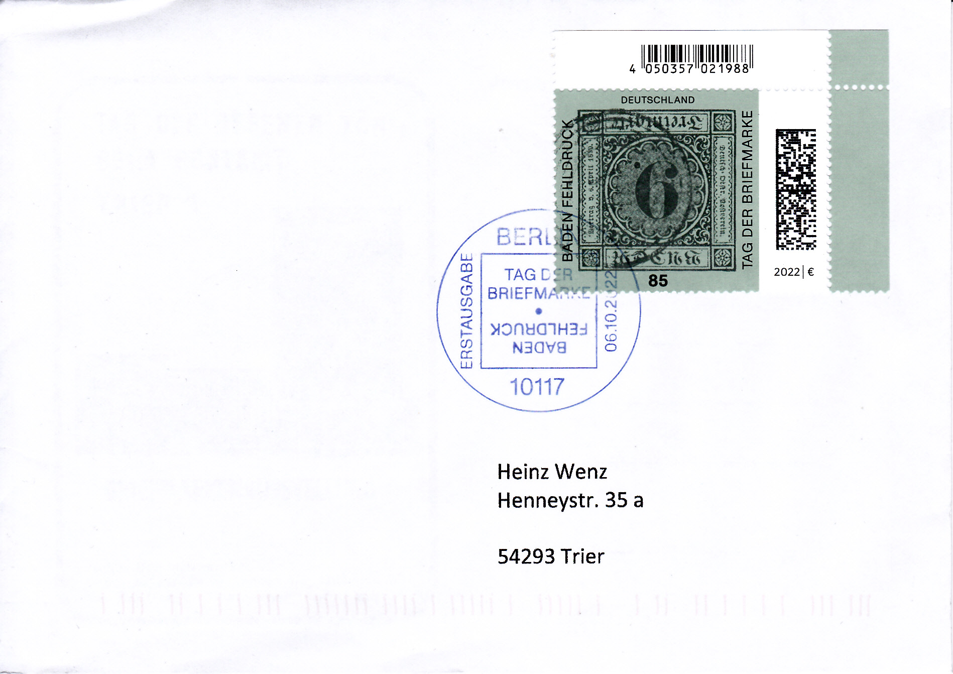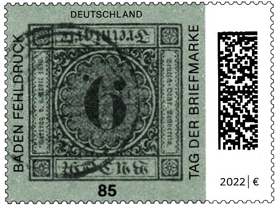 Zum Tag der Briefmarke 2021 ist bei der Deutschen Post eine Marke (MiNr 3719) mit dem Baden-Fehldruck MiNr. 4 F erschienen. Die Marke in schwarz auf blaugrünem statt lilarosa Papier, entwertet mit einem Fünfring-Nummernstempel "41", ist kopfstehend abgebildet.