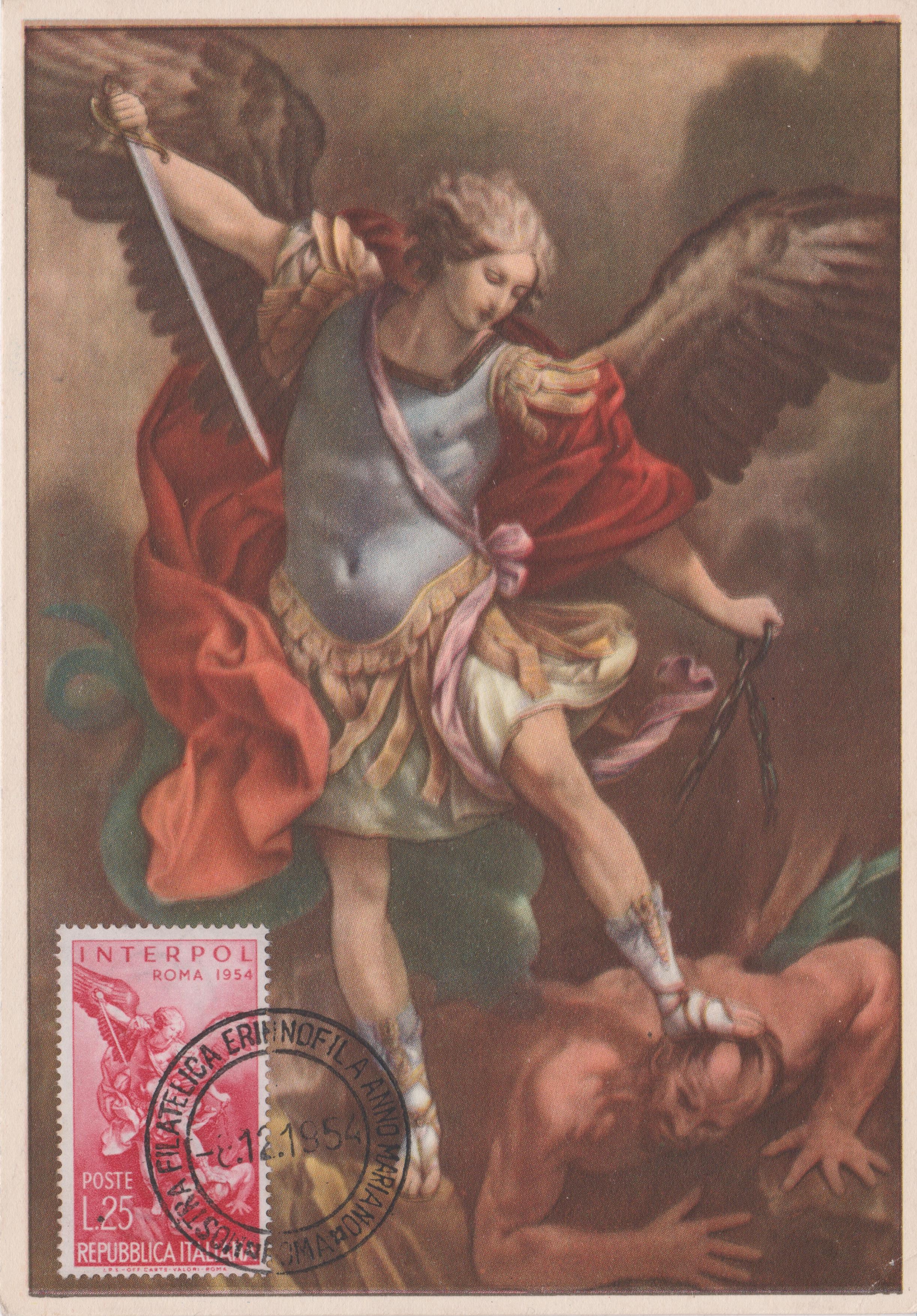 Diese Maximumkarte aus Italien zeigt ein Gemälde von Guido Reni "Erzengel Michael im Kampf mit dem Drachen" auf dem am 09.10.1954 zur Interpol-Konferenz erschienenen Postwertzeichen Italien MiNr. 917: