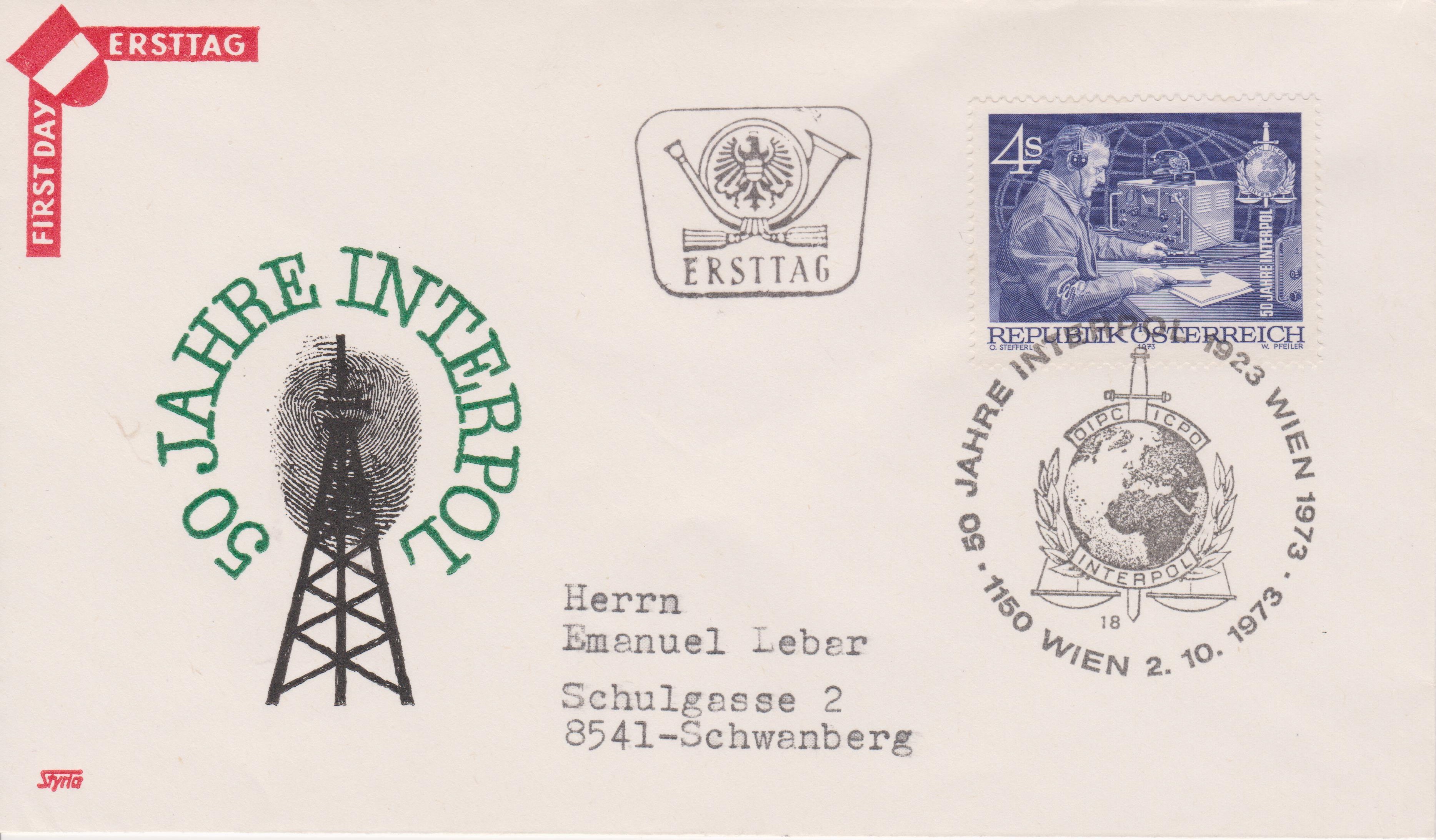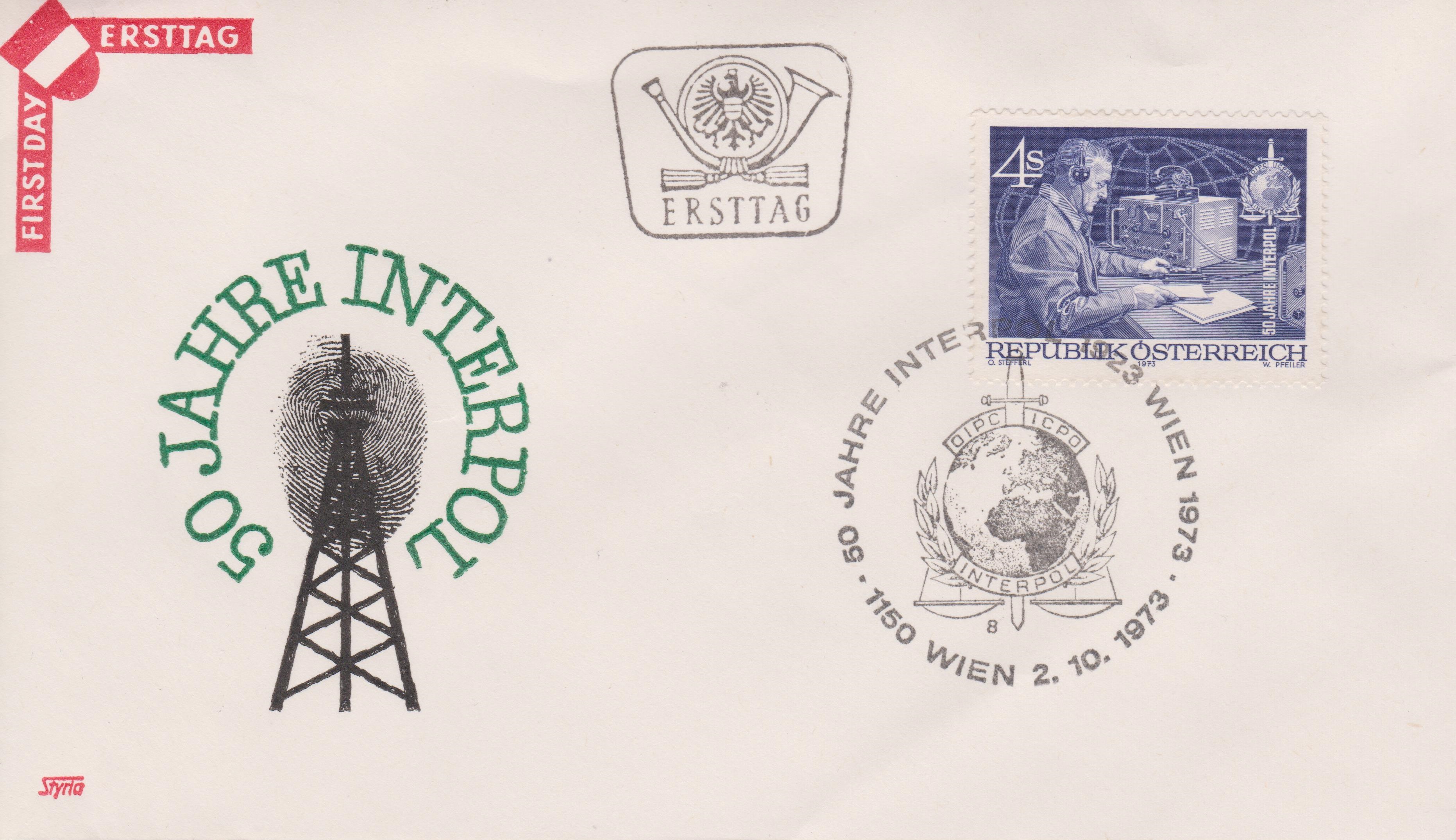 FDC "50 JAHRE INTERPOL" mit Ersttagsstempel Wien mit der Kennziffer "1":