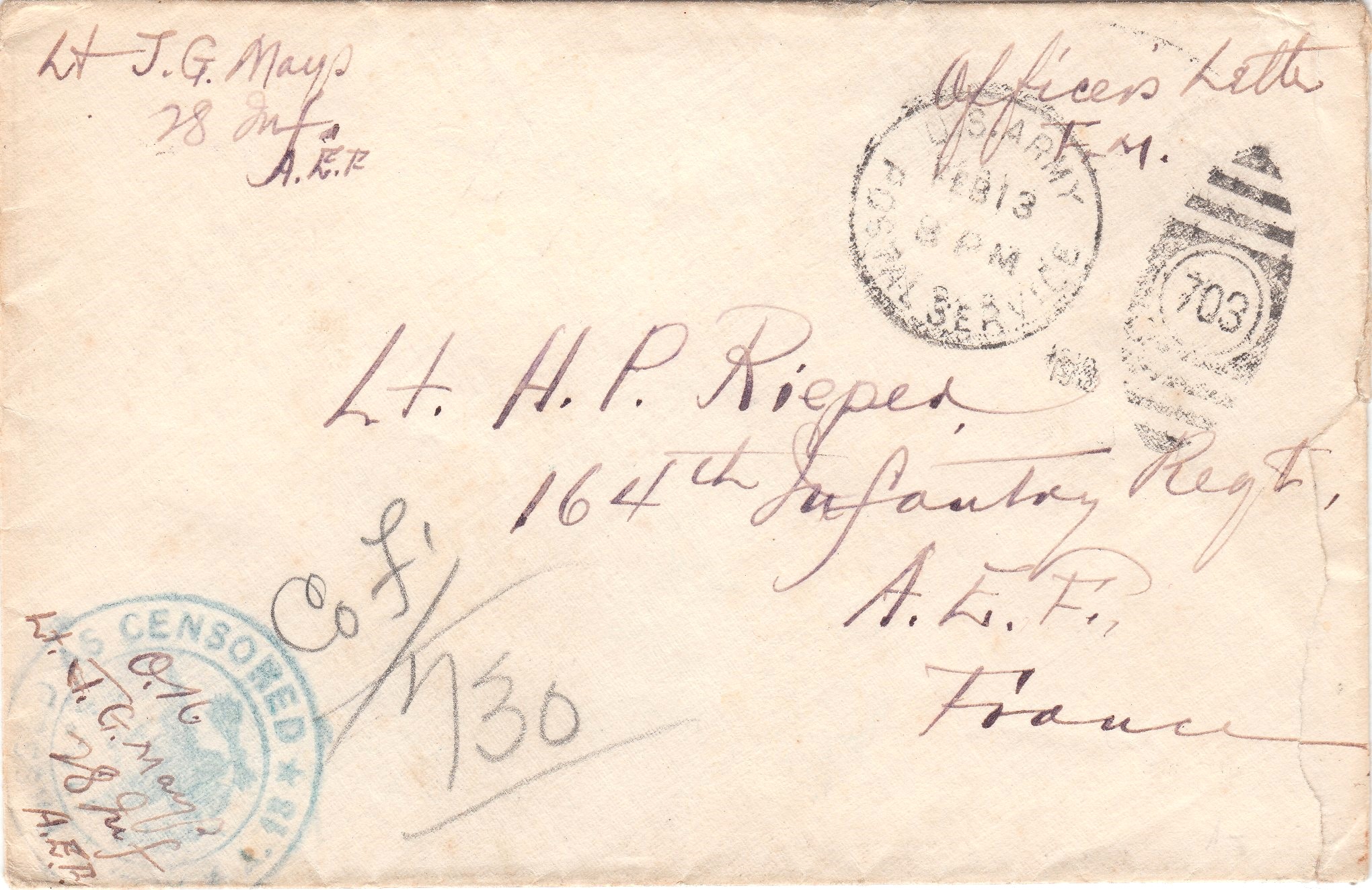 Die Feldpost dieser Soldaten wurde zensuriert, worauf bei diesem Beispiel, einem "Officer's Letter" = Offiziersbrief, aufgegeben am 13.02.1918 beim Armeepostamt "703", ein Zensurstempel in Form eines Zweikreisstempels 32/27 mm mit der Inschrift "A.E.F. PASSED AS CENSORED + A. 13 +" hinweist: