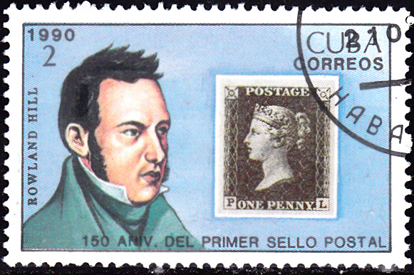 Zum Jubiläum "150 Jahre Briefmarken" wurde in Kuba in einer Serie diese Marke (MiNr 3382) mit Rowland Hill (1795–1879, britischer Postfachmann) und der Marke Großbritannien MiNr. 1 verausgabt.