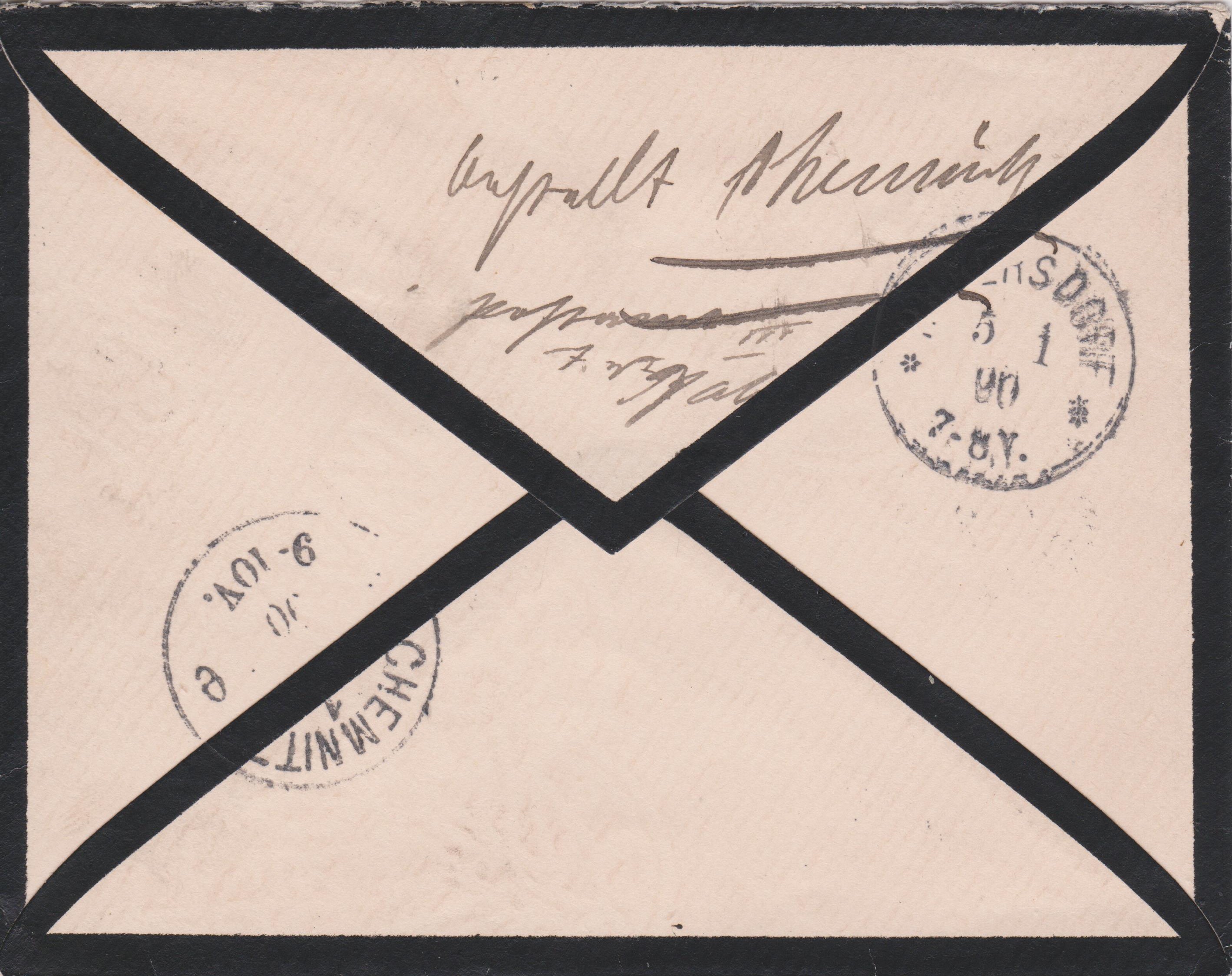 Daher wurde am 27.12.1946 die als ungültig erkannte Frankatur dieses Trauerbriefes mit Blaustift umrahmt und der Tagesstempel PLETTENBERG 1 wurde links daneben abgeschlagen. Am Bestimmungsort Altena wurde das Eineinhalbfache des fehlenden Portos von 6 Pf = "9" Pf per Blaustift vermerkt und als "Nachgebühr" erhoben.