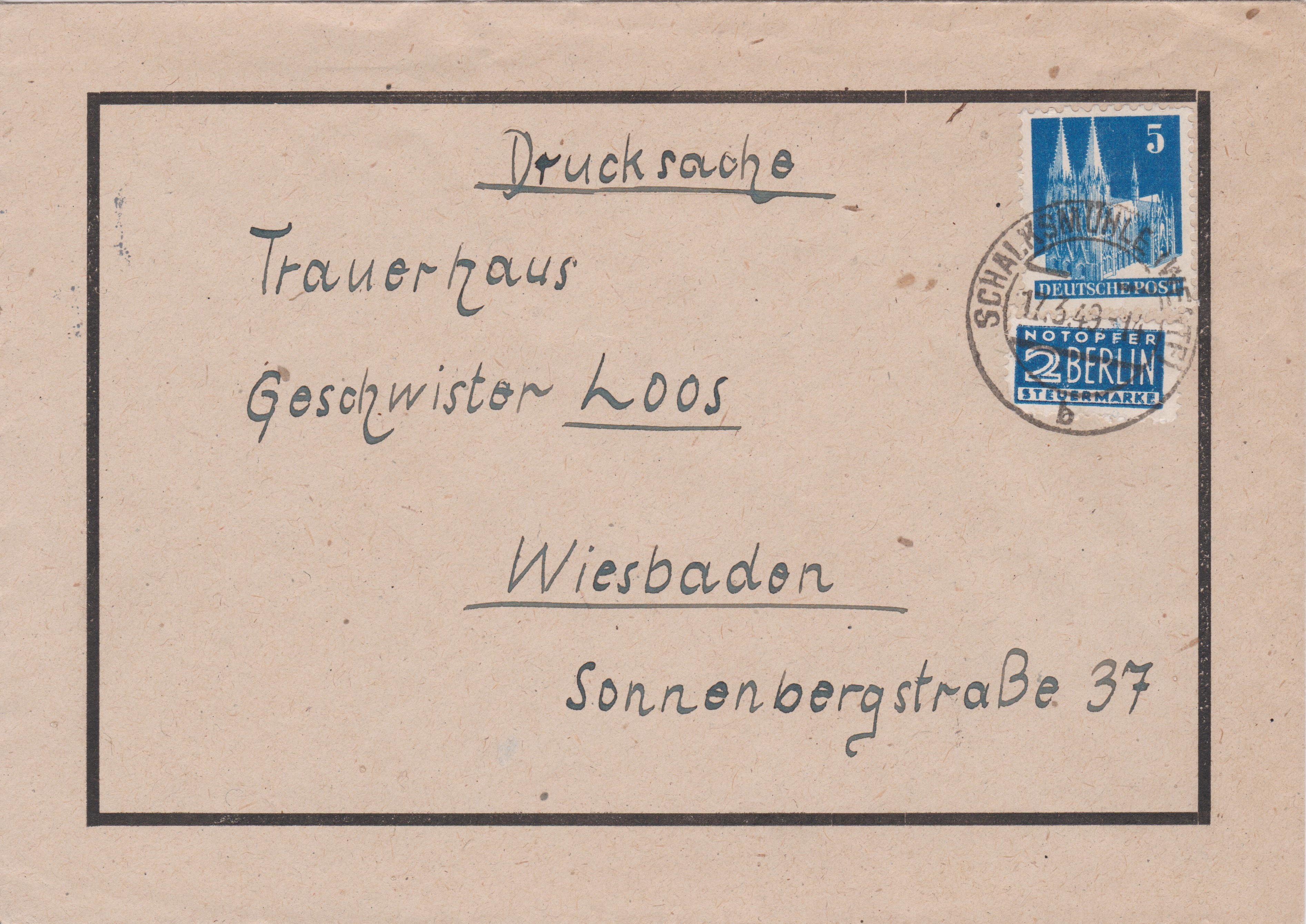 Trauerbrief, an 27.12.1946 in PLETTENBERG 1 als Drucksache, Portostufe 6 Pf, freigemacht mit zwei Postwertzeichen AM POST 3 Pf: