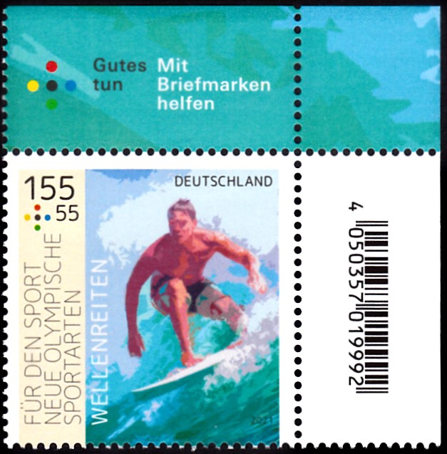 Auf dieser Marke (MiNr 3604) der Serie "Für den Sport" 2021 der Deutschen Post wird einen Surfer abgebildet: