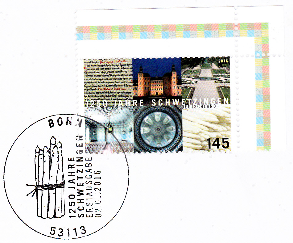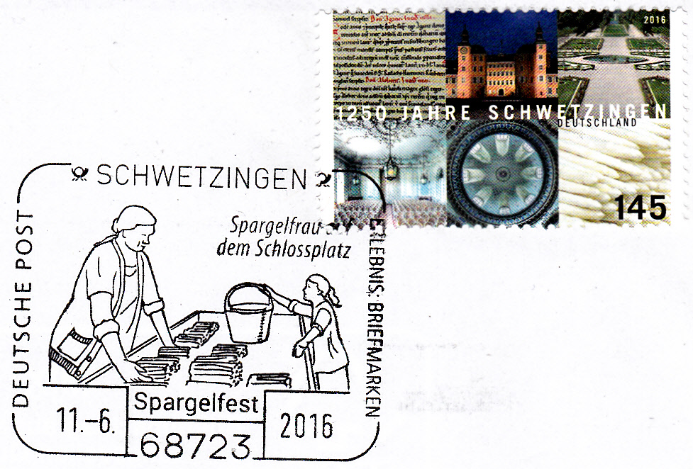 Da ist es nicht verwunderlich, dass im Markenbild der Sondermarke der Deutschen Post neben dem Lorscher Codex, dem Schloss Schwetzingen und dem Schlossgarten, dem Mozartsaal und der Kuppel der Gartenmoschee auch Spargelstangen abgebildet sind: