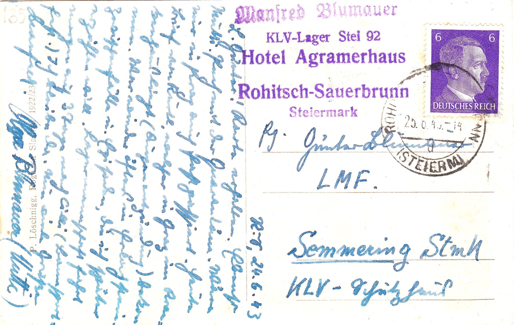Die Karte wurde mit einem fünfzeiligen Absenderstempel in Violett versehen "Manfred Blumauer KLV-Lager Stei 92 Hotel Agramerhaus Rohitsch-Sauerbrunn Steiermark" und am 25.06.1943 bei der Post aufgegeben.