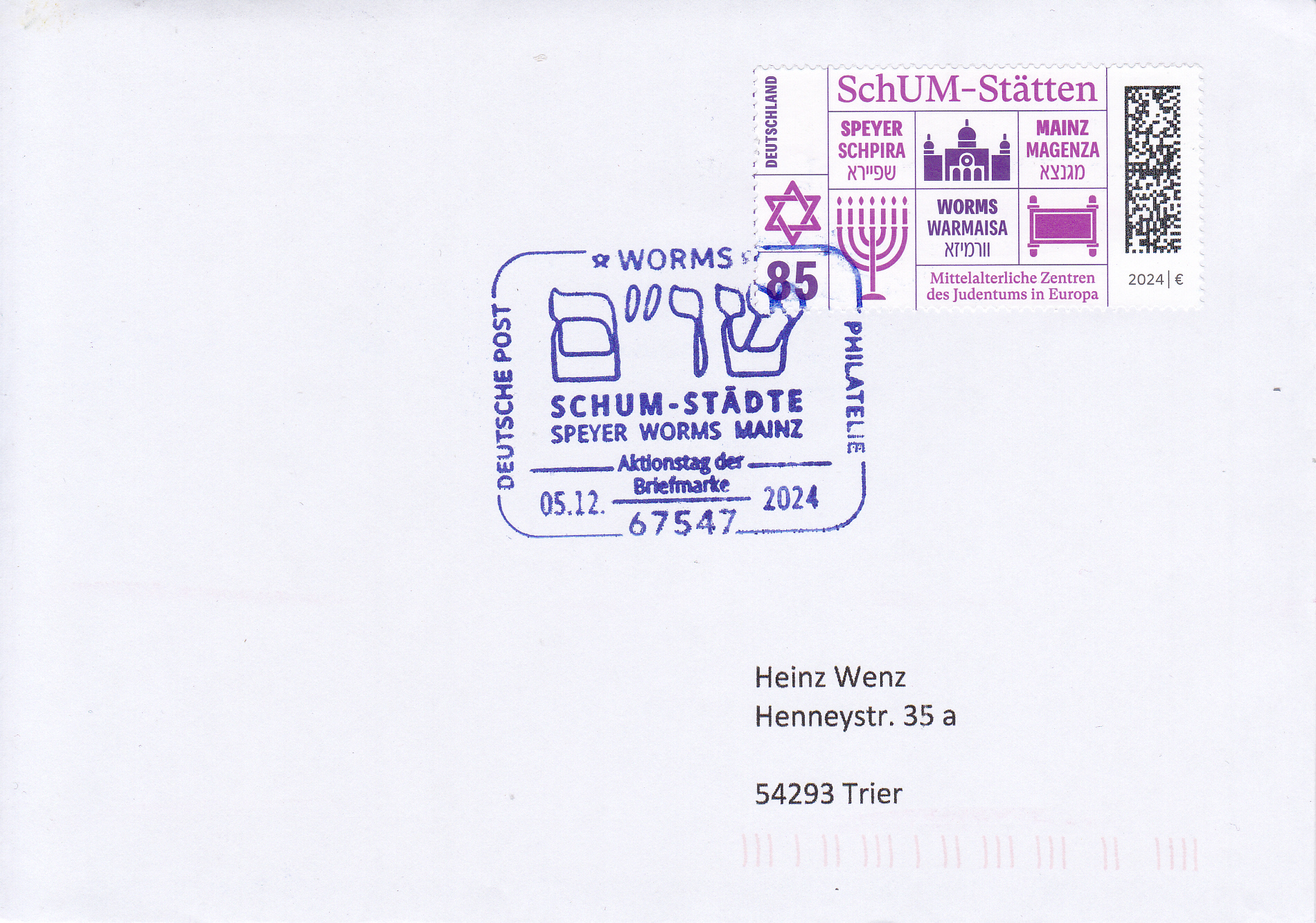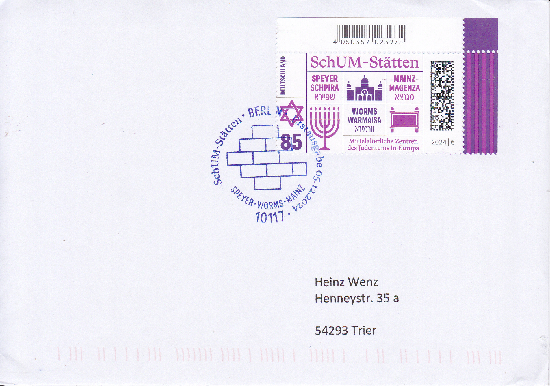 Bei der Deutschen Post ist diese Marke (MiNr 3872) mit der Abbildung von einem Davidstern, einer Menora, einer Synagoge und einer Thora mit dem Akronym "SchUM", gebildet aus den hebräischen Anfangsbuchstaben der Städte Speyer, Worms und Mainz. Hier zeige ich eine Marke vom Eckrand mit EAN-Coduerung.