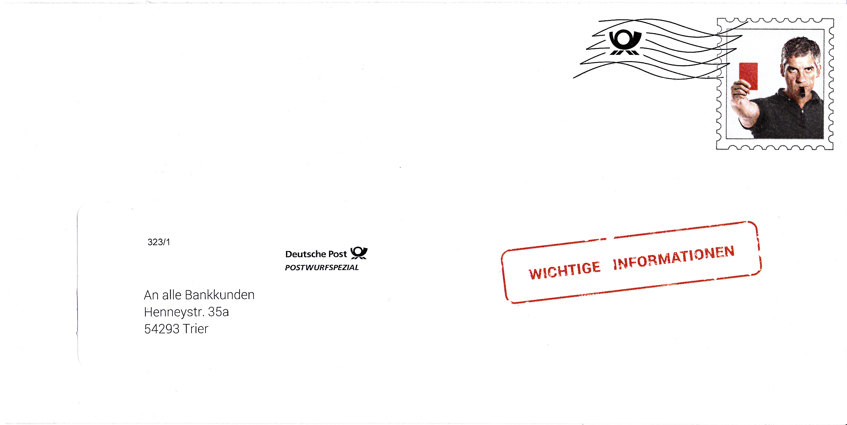 Hier eine Postwurfspezialsendung mit der Anschrift "An alle Bankkunden ...". Interessant ist hierbei auch der markenähnliche Zudruck oben rechts mit einer Wellen"entwertung".
