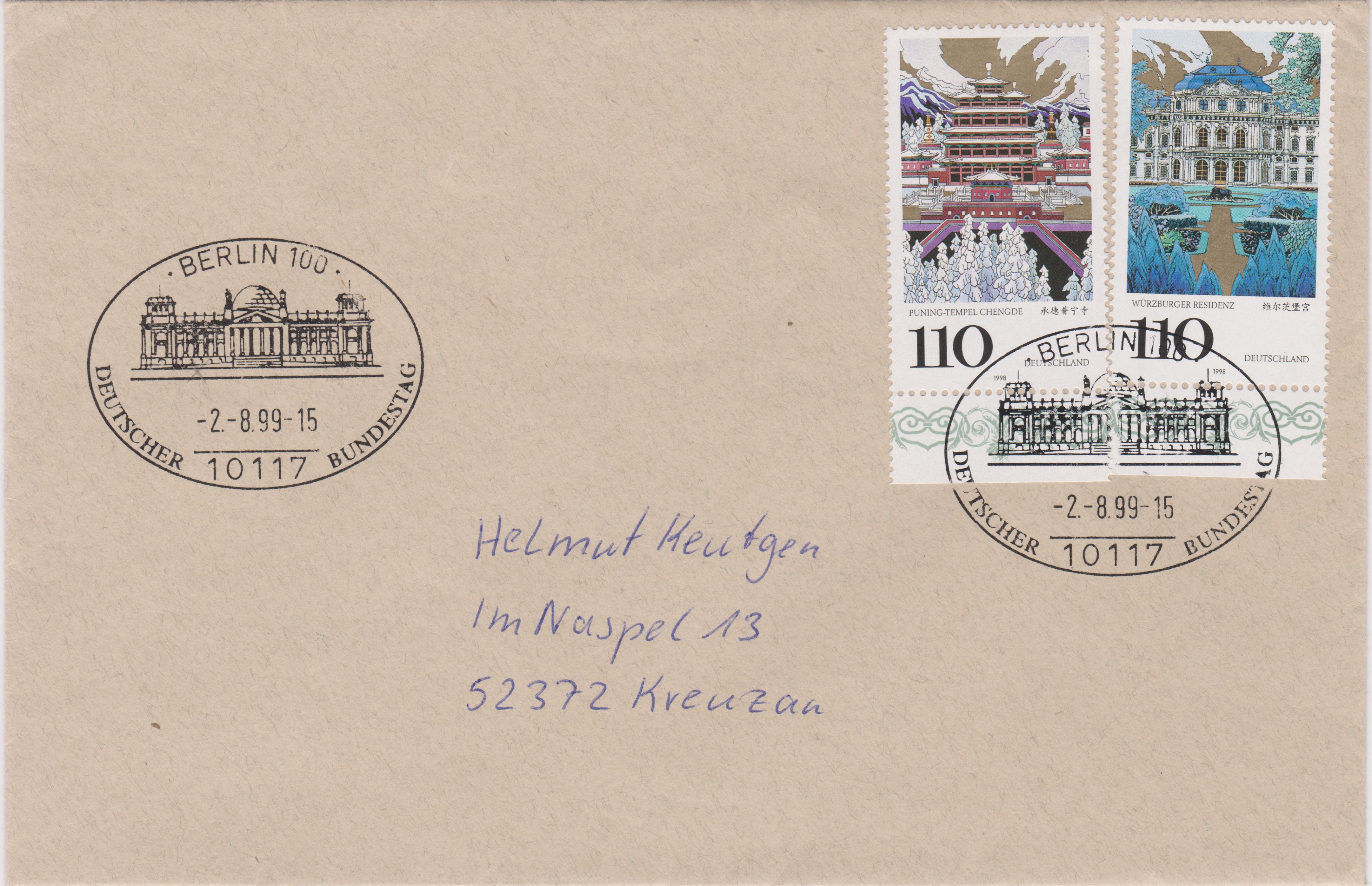 Am 20.08.1998 erschienen MiNr. 2007/2008 als Satz "UNESCO-Welterbe VII", hier am 02.08.1999 auf Brief mit Sonderstempel BERLIN 100 DEUTSCHER BUNDESTAG: