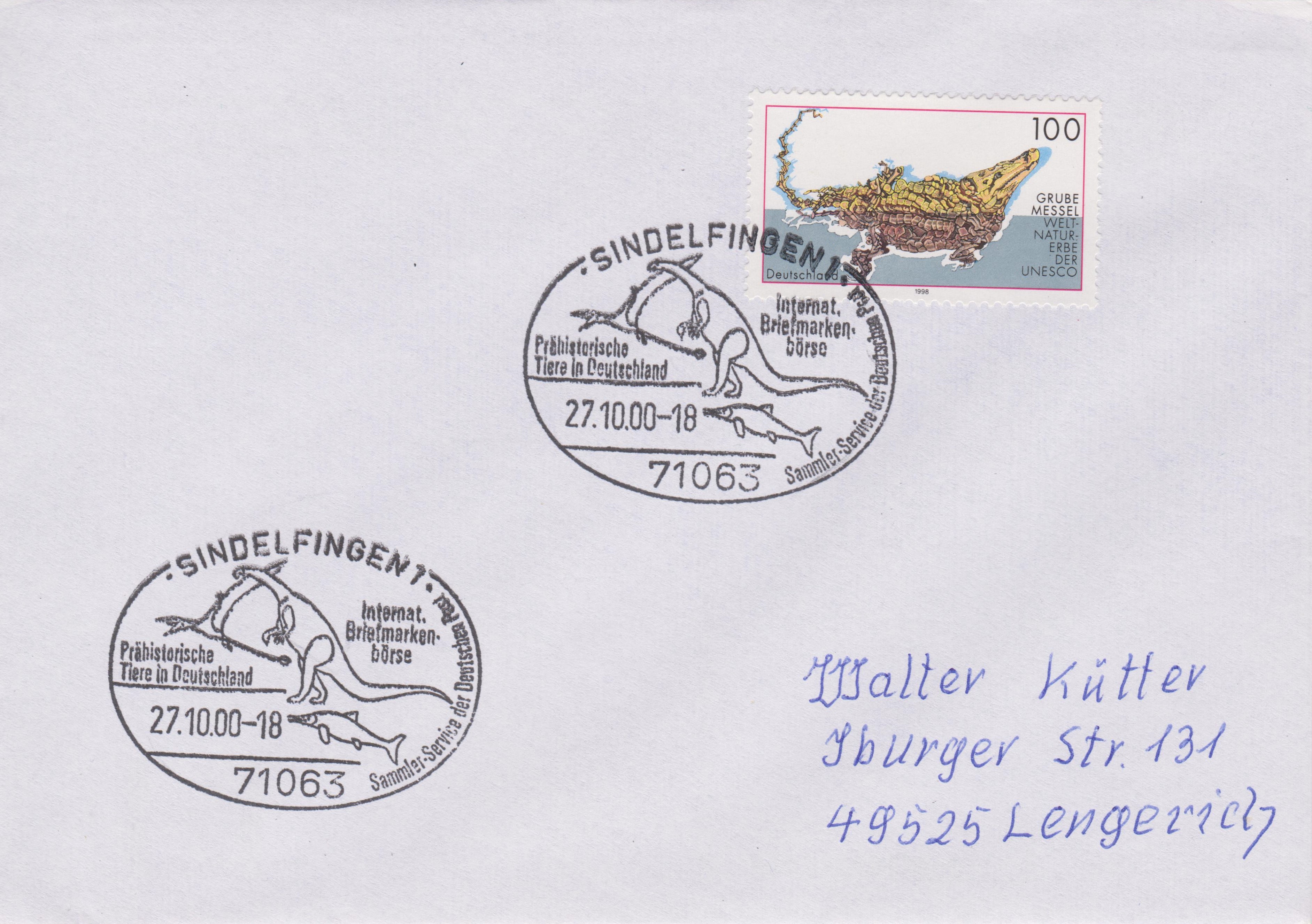 BUND MiNr. 2006 "GRUBE MESSEL" auf Brief mit thenatisch passendem Sonderstempel "Prähistorische Tiere in Deutschland" aus 71063 SINDELFINGEN vom 27.10.2000: