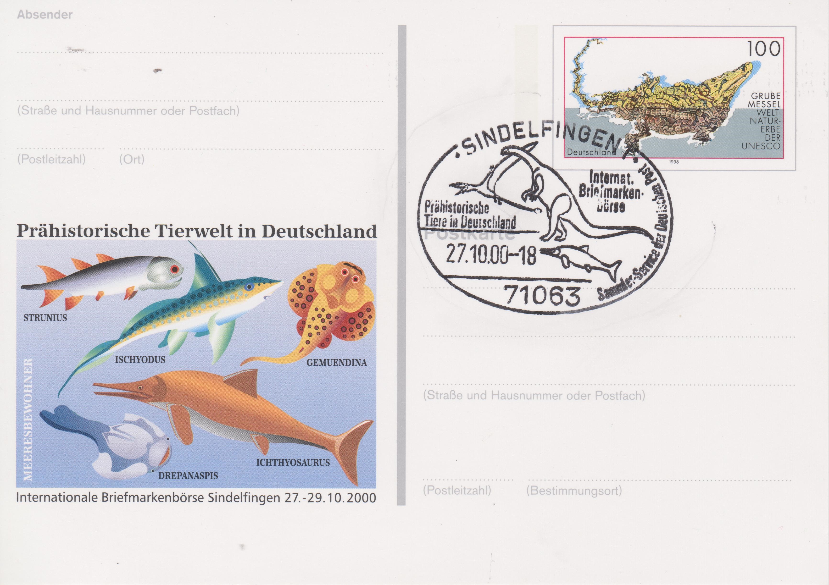 Ganzsache mit BUND MiNr. 2006 "GRUBE MESSEL" mit thenatisch passendem Sonderstempel "Prähistorische Tiere in Deutschland" aus 71063 SINDELFINGEN vom 27.10.2000:
