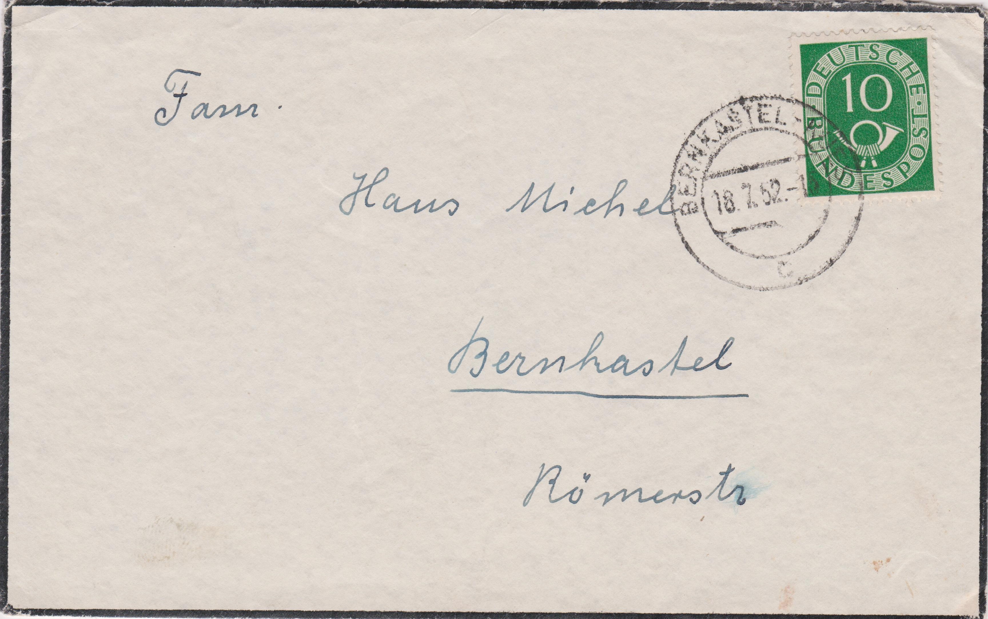 Trauerbrief, frankiert per Einzelfrankatur 10 Pf Posthorn am 18.07.1952 im Ortsverkehr von BERNKASTEL: