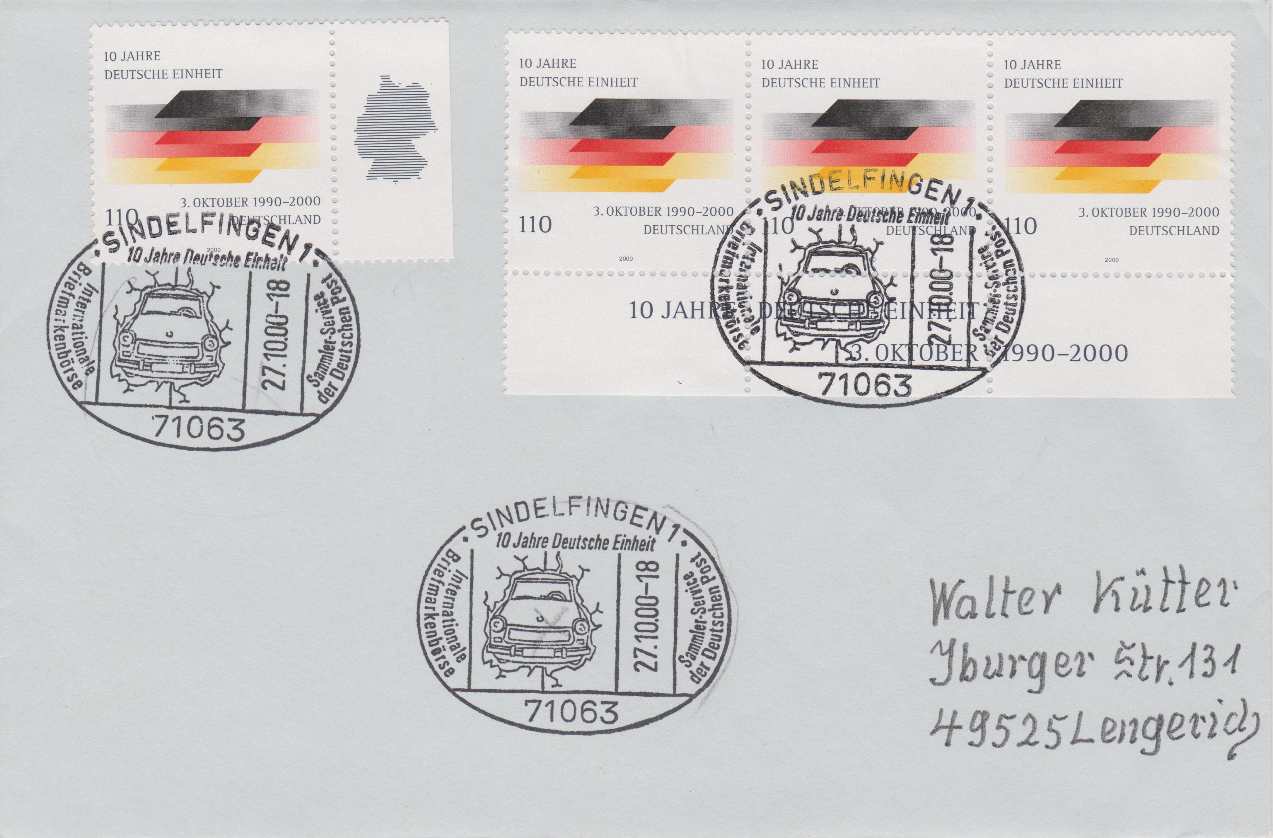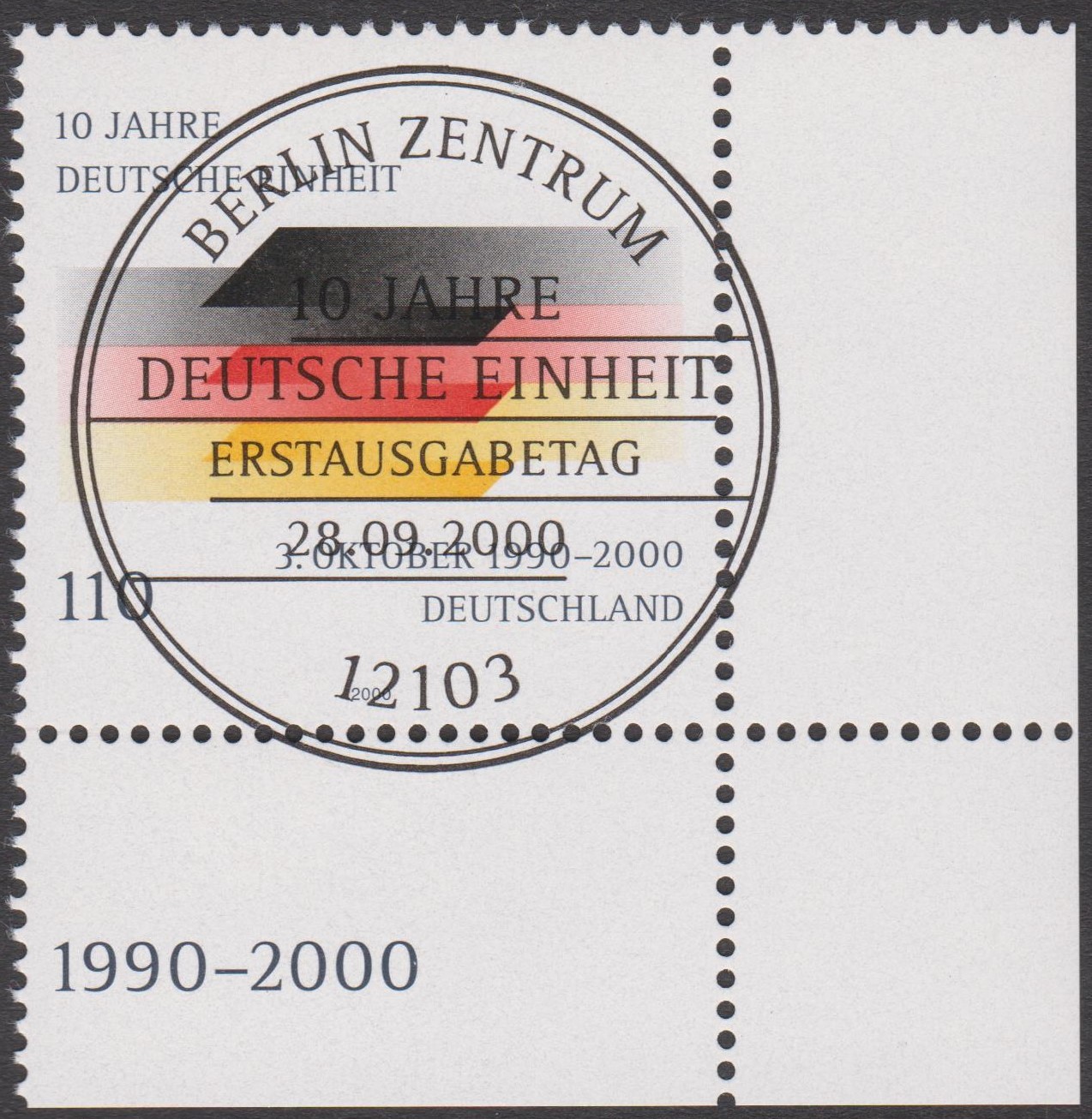 Den Anfang macht Bund MiNr. 2142, die durch verzahnte Farben die deutsche Staatsflagge als Zeichen für "10 Jahre Deutsche Einheit" darstellt, hier auf ETB 45/2000: