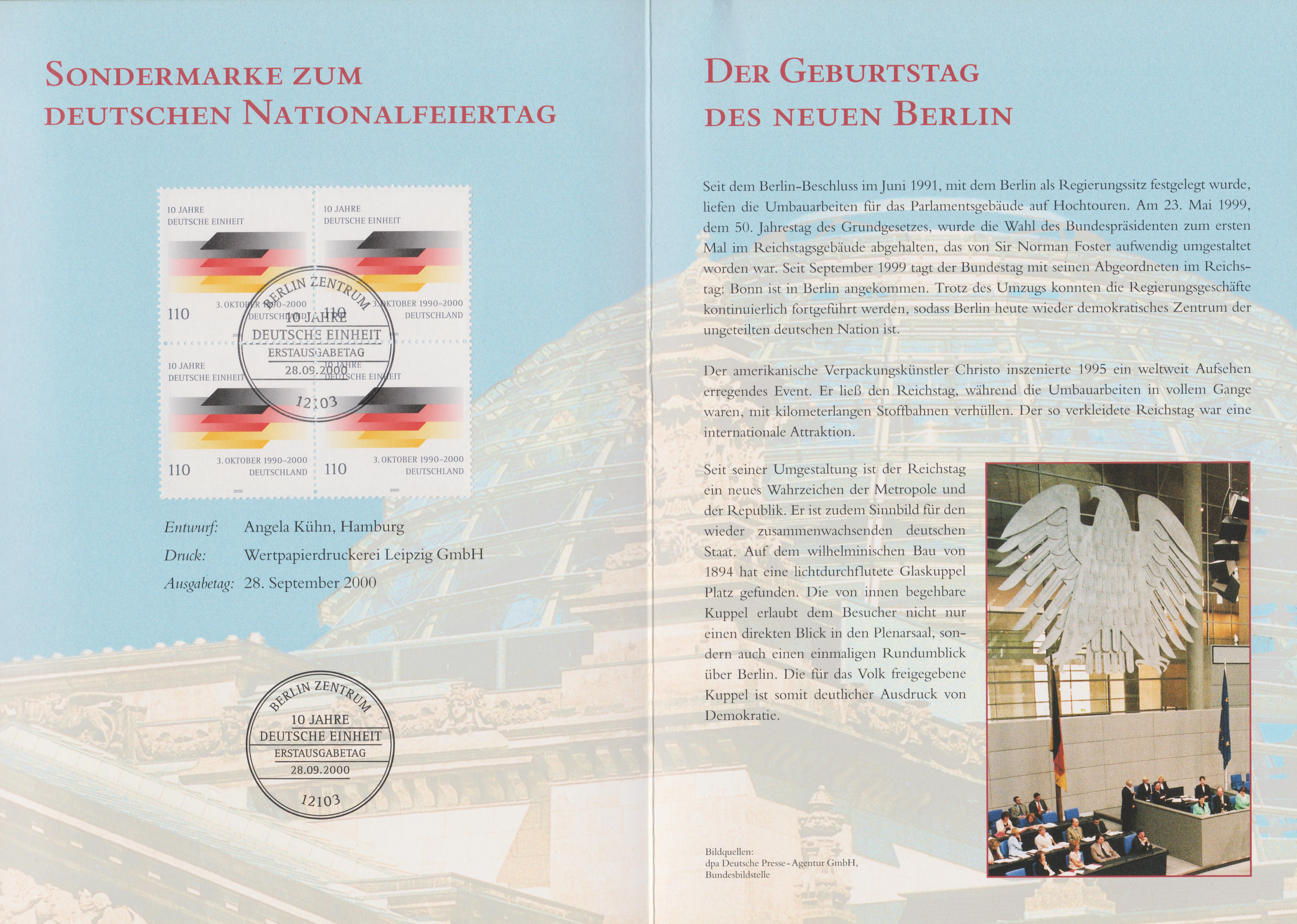Faltblatt "10 JAHRE DEUTSCHE EINHEIT" mit Viererblock Bund MiNr. 2142 mit ESST BERLIN ZENTRUM: