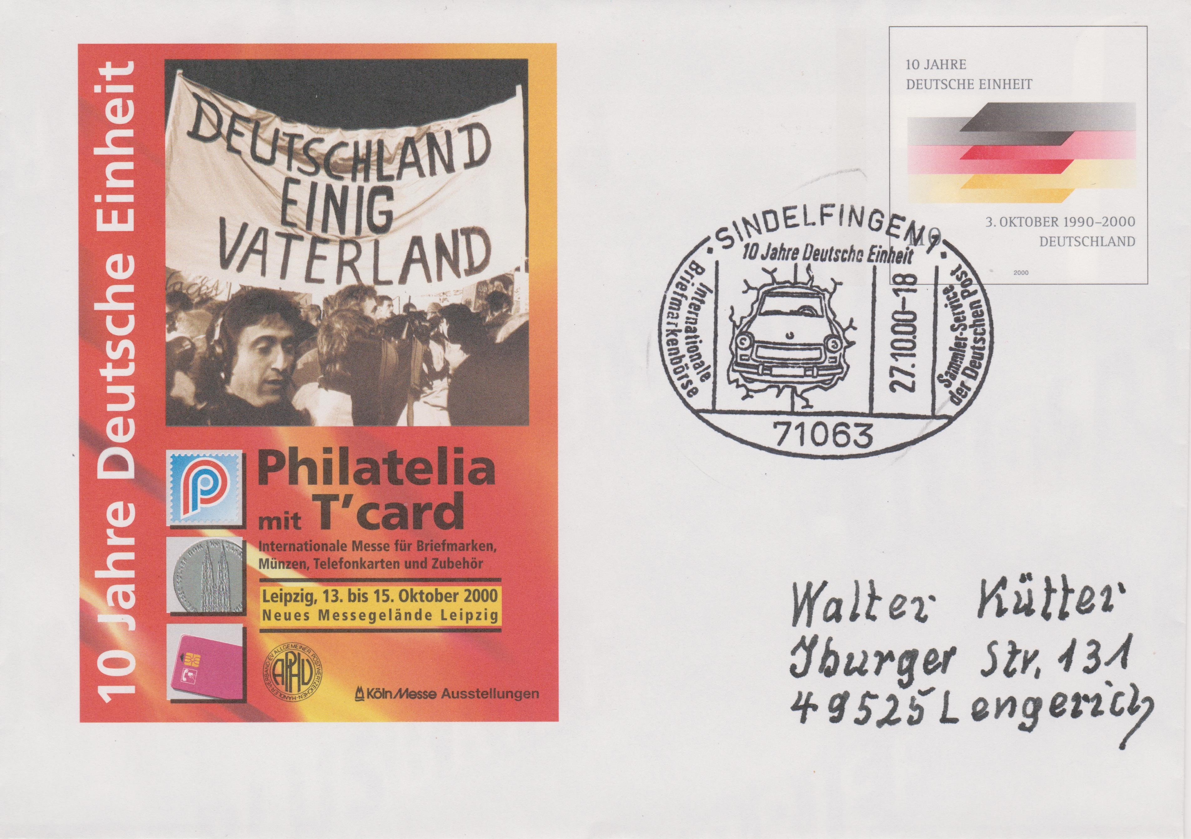 Ganzsache, USo 16, "10 Jahre Deutsche Einheit" mit thematisch perfekt passendem Sonderstempel SINDELFINGEN vom 27.10.2000: