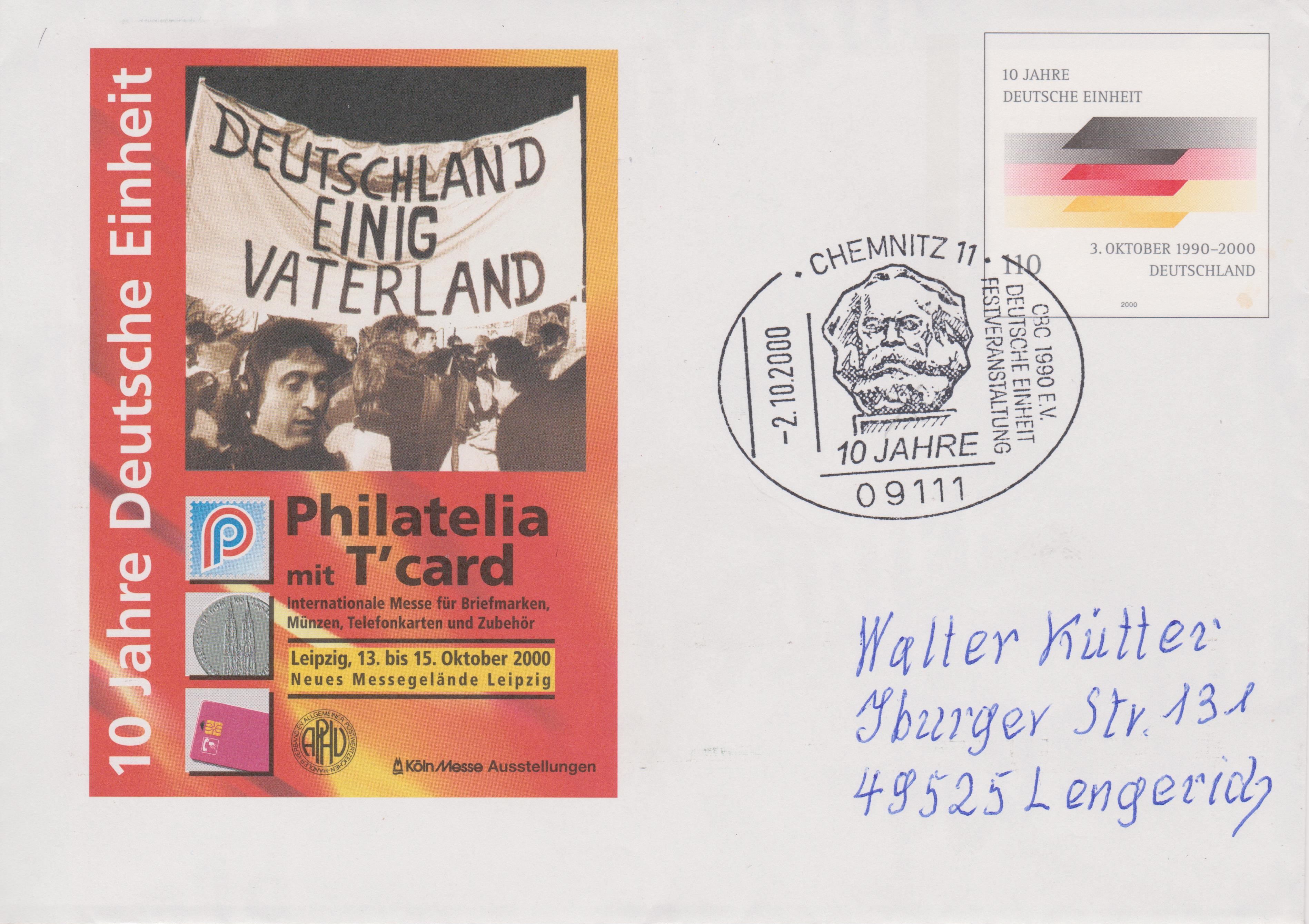 Ganzsache, USo 16, "10 Jahre Deutsche Einheit" mit thematisch perfekt passendem Sonderstempel CHEMNITZ von der "DEUTSCHE EINHEIT FESTVERANSTALTUNG" am 02.10.2000: