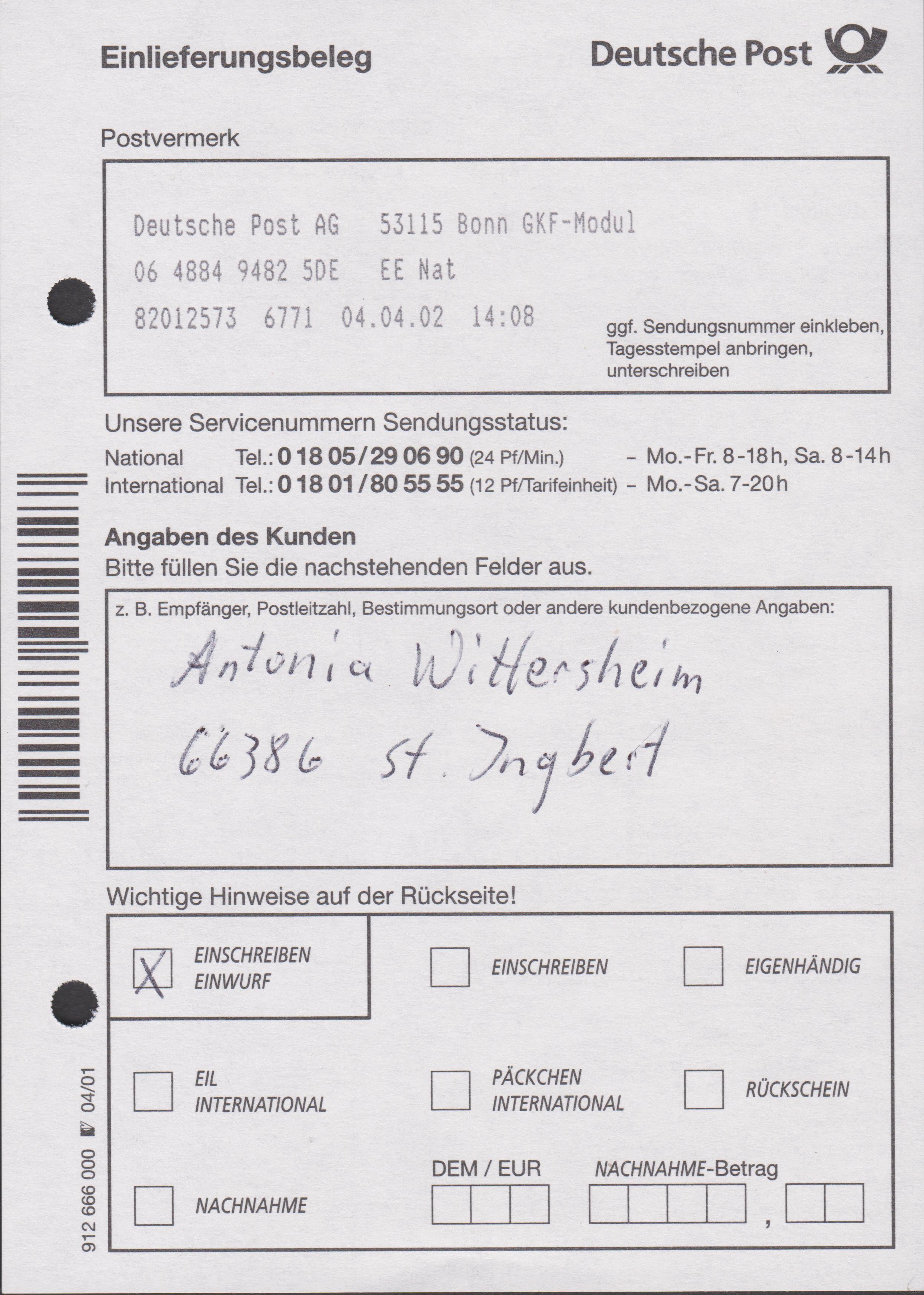 Es wurde ein Taxstempel "T /1300" angebracht. In Deutschland wurde das deutsche Postwertzeichen als Frankatur nachträglich anerkannt und dieses wurde durch einen diagonalen Strich mit Kugelschreiber entwertet. Vorderseitig wurde eine Codierung angebracht, der Beleg ist also echt gelaufen!