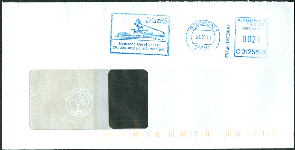 Ein Maschinen-Stempel in Rot der "Deutsche Gesellschaft zur Rettung Schiffbrüchiger" aus dem Jahr 1995. Also noch aus der DM-Zeit.