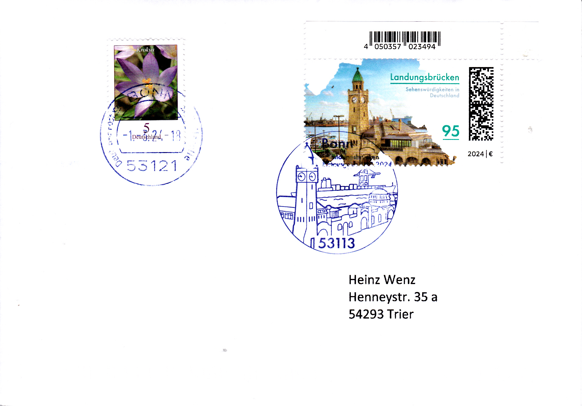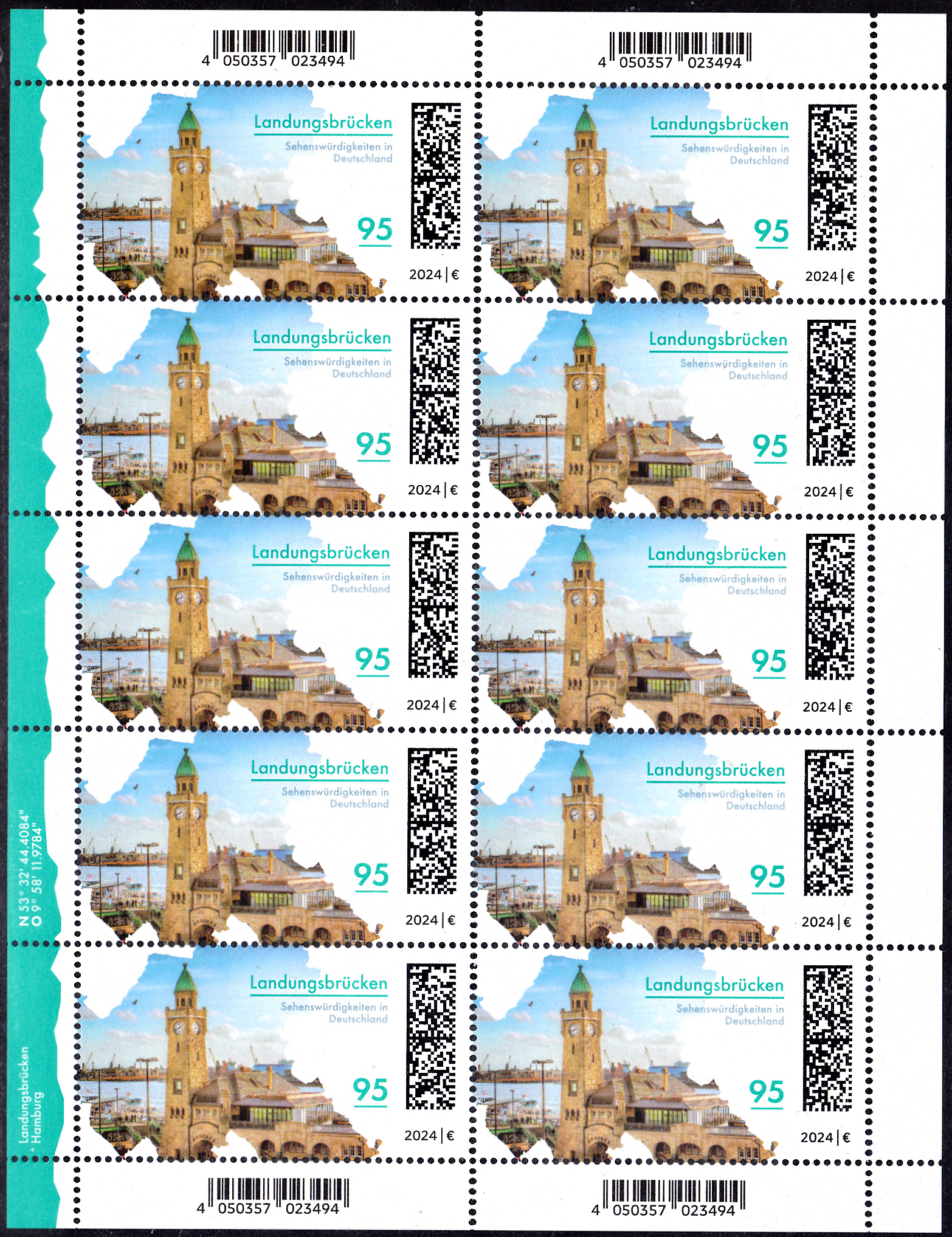 In der Serie "Sehenswürdigkeiten in Deutschland" ist eine Marke (MiNr 3818) mit den Landungsbrücken am Hamburger Hafen erschienen. Hier zeige ich eine Marke vom Eckrand mit EAN-Codierung.