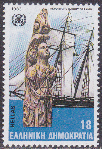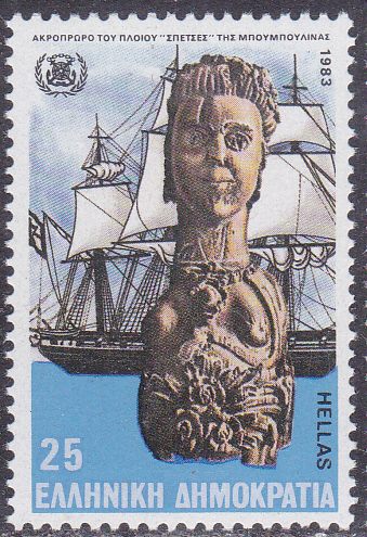 Aus Griechenland kommt diese Marke (MiNr 1505) mit der Galionsfigur der Brigg "Aris" unter Kapitän Tsamados (griechisch: Αναστάσιος Τσαμαδός; geb. 1774 in Hydra; gest. 1825 in Sphacteria; war ein griechischer Admiral des griechischen Unabhängigkeitskrieges).