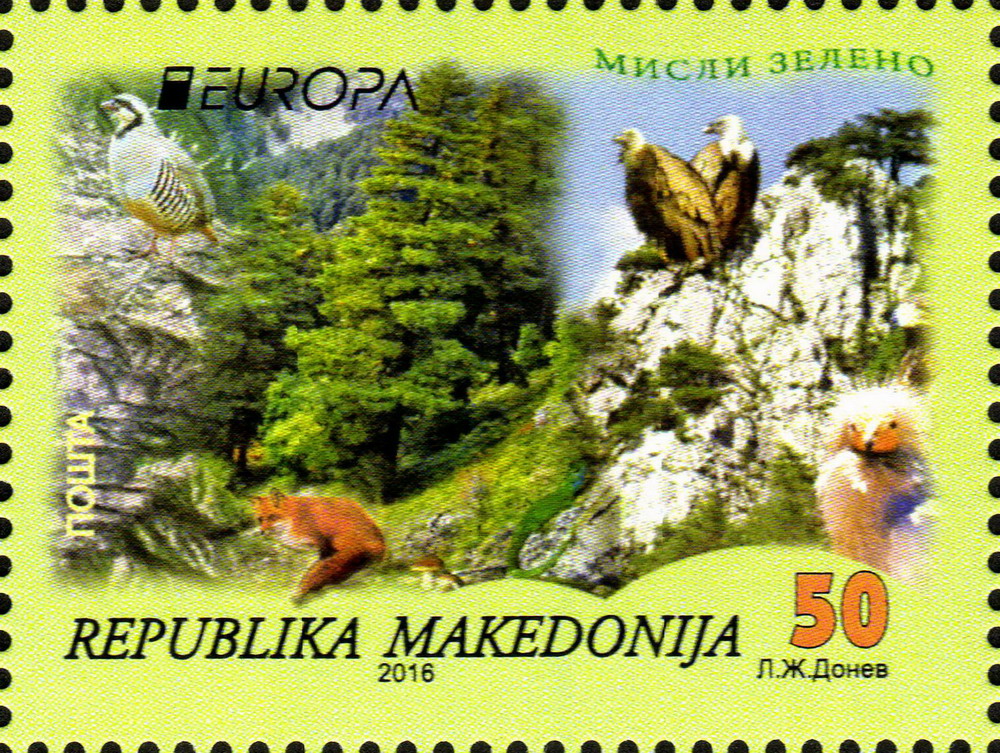 Eine Europamarke 2016 (MiNr 755) aus Makedonien (Nordmazedoniel) bildet rechts unten auf der Marke auch einen Schmutzgeier (Neophron percnopterus) ab.