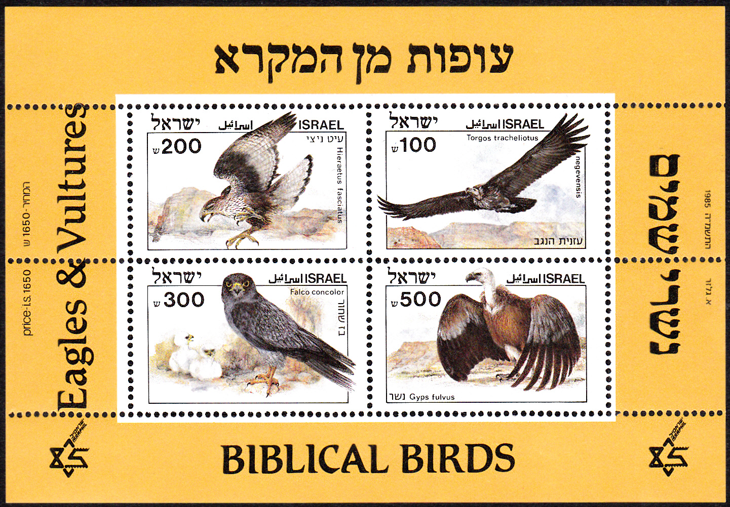 Diese Marke aus Israel (MiNr 982) zeigt uns einen Habichtsadler (Hieraetus fasciatus) bei einem Sturzflug und auf dem anhängenden Tab einen Kopf des Vogels.