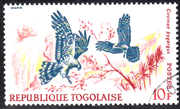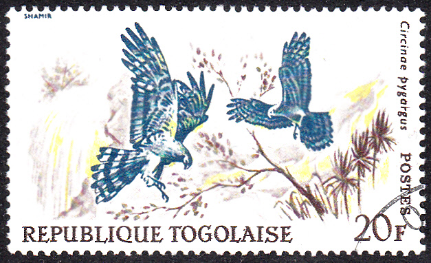 Hier zeige ich eine Marke Togo (MiNr 599 A) mit zwei Wiesenweihen (Circus pygargus).
