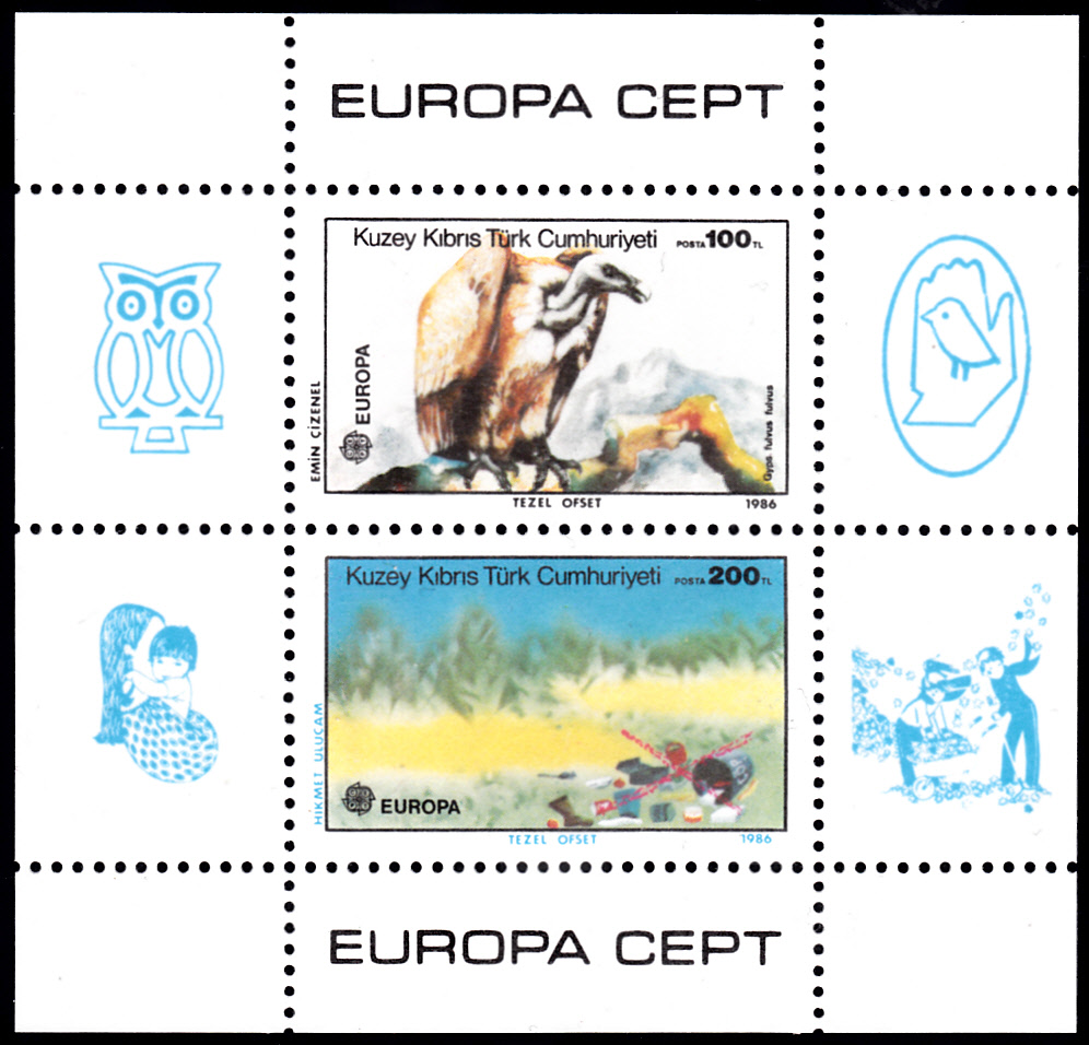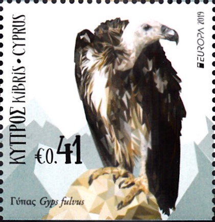 Auf einer Europamarke 2019 aus Zypern (MiNr 1408) wird ein Gänsegeier (Gyps fulvus) gezeigt. Hier zeige ich eine vierseitig gezähnte Marke (MiNr 1408 A).