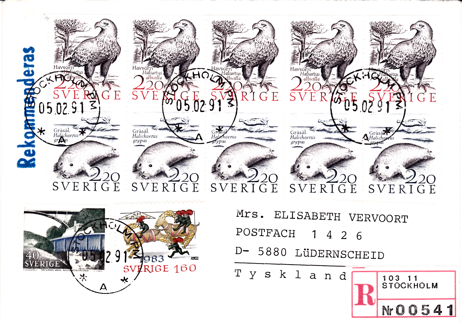 Bei diesem Brief mit der Marke "Seeadler" und dem Ersttagsonderstempel Bonn ist eine nachträgliche Beschriftung nicht auszuschließen, er wurde möglicherweise nur gefälligkeitsgestempelt (zweiter Stempel im Anschriftenfeld) und später mit der Anschrift versehen.