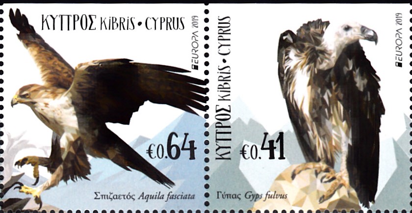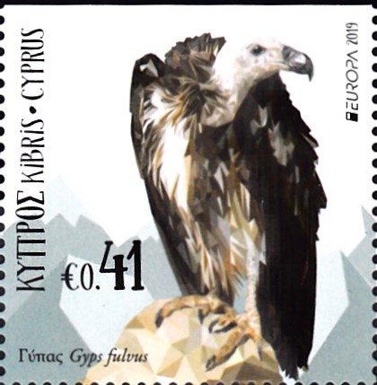 Auf einer Europamarke 2019 aus Zypern (MiNr 1408) wird ein Gänsegeier (Gyps fulvus) gezeigt. Hier zeige ich eine vierseitig gezähnte Marke (MiNr 1408 A).