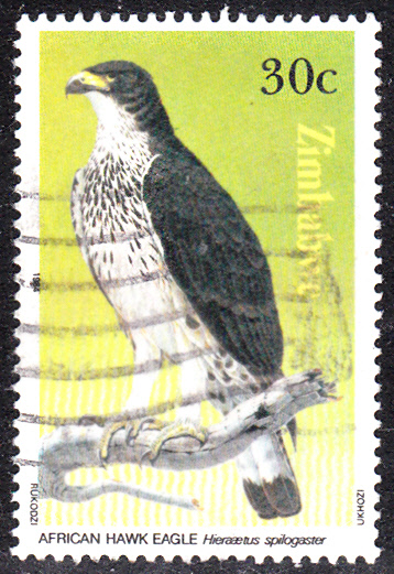 Auf dieser Marke aus Simbabwe (MiNr 302) ist ein Afrikanischer Habichtsadler (Hieraaetus spilogaster) zu sehen.