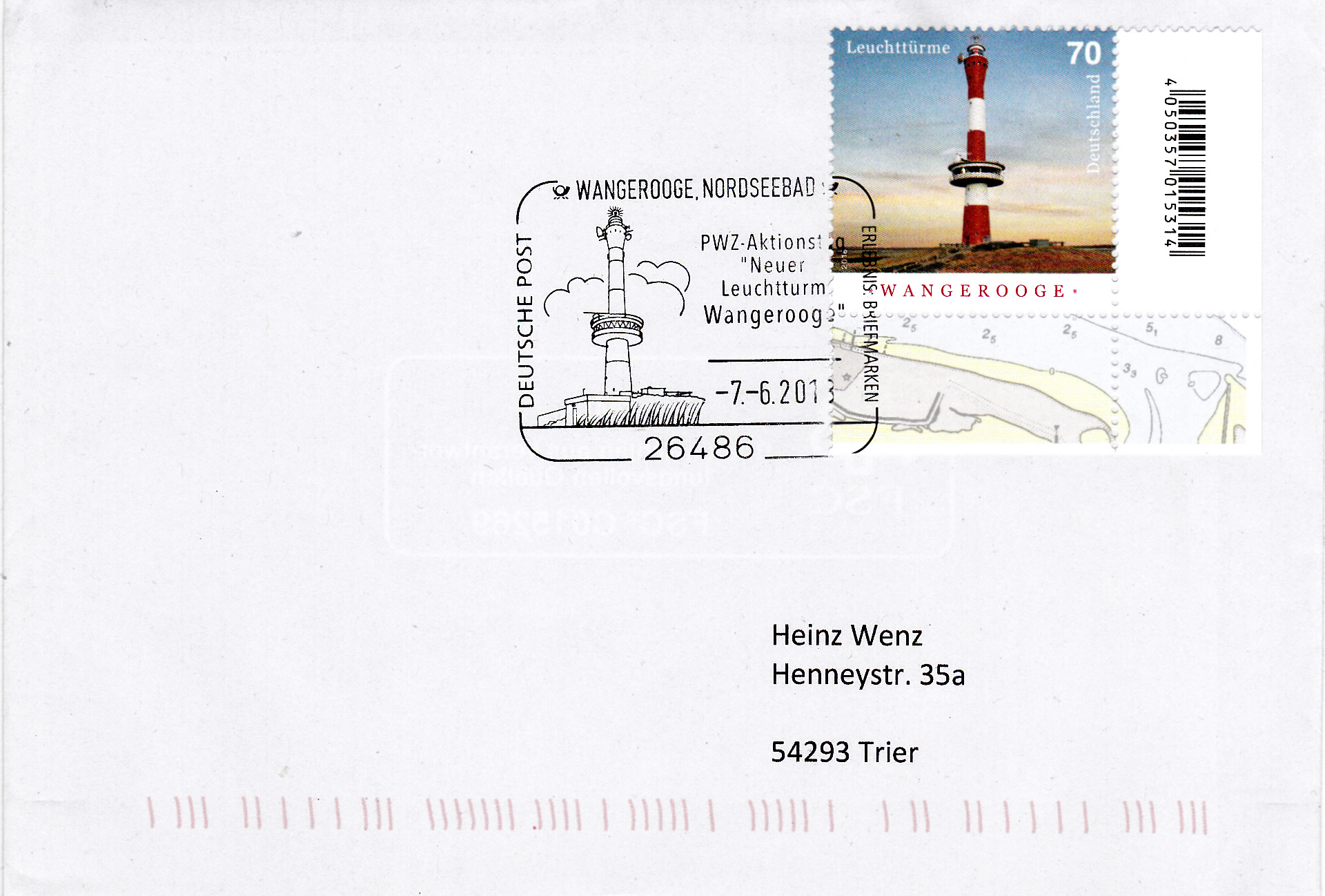 Zur Marke mit dem Leuchtturm Wangerooge gab es im Nordseebad Wangerooge am Ausgabetag einen Sonderstempel, der im Stempelbild ebenfalls den Leuchtturm zeigt.