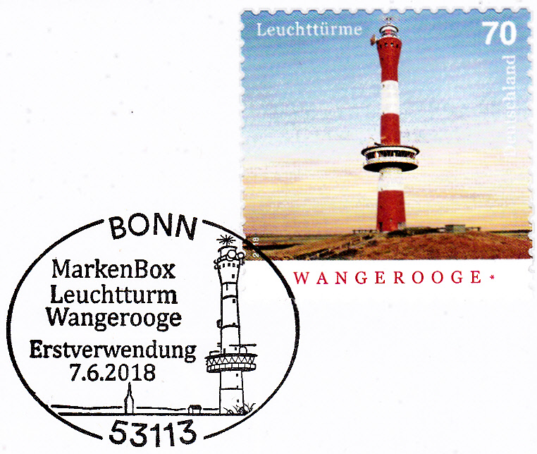 Für die beiden Leuchtturmmarken der Deutschen Post vom 7.6.2018 gab es wie üblich auch Ersttagsonderstempel. Hier die Marke mit dem Leuchtturm Darßer Ort und dem Stempel aus Bonn.