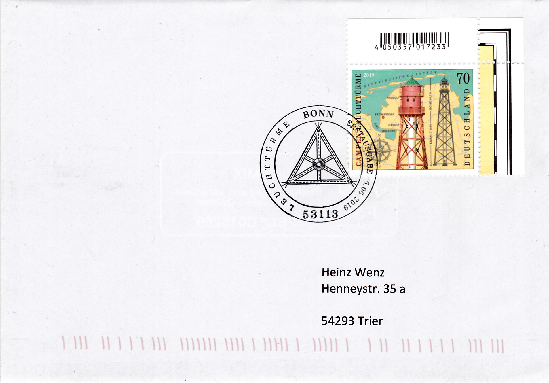 Brief mit der Marke "Leuchtturm Campen" mit dem Ersttagsonderstempel aus Bonn.