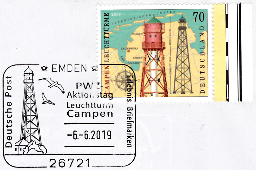 Am Ausgabetag der Marke Leuchttürme Campen wurde auch in Emden ein Sonderstempel mit dem Leuchtturm Campen verwendet.