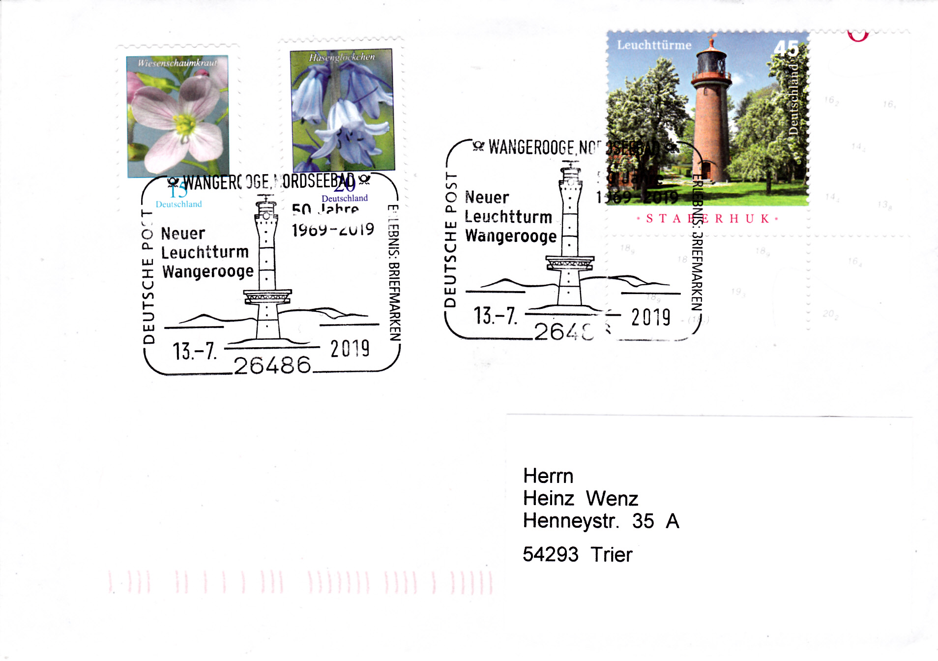 Der bereits beschriebene Neue Leuchtturm Wangerooge wurde auch im Sonderstempel aus Wangerooge vom 13.7.2019 zum Jubiläum "50 Jahre Leuchtturm" als Stempelmotiv verwendet.