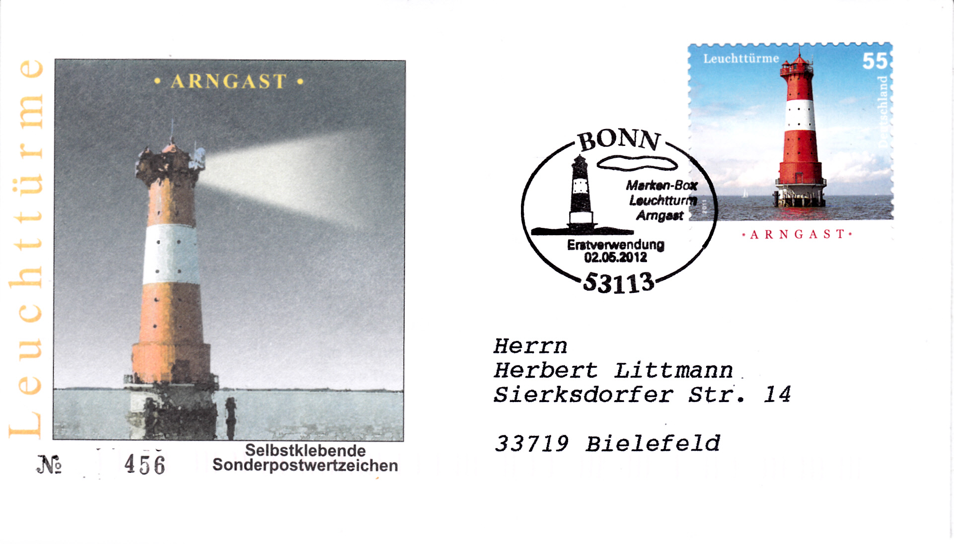 Im Erstverwendungsstempel zur selbstklebenden Ausgabe Leuchtturm Arngast (MiNr 2935) wird ebenfalls dieser berteits hier beschriebene Leuchtturm gezeigt.