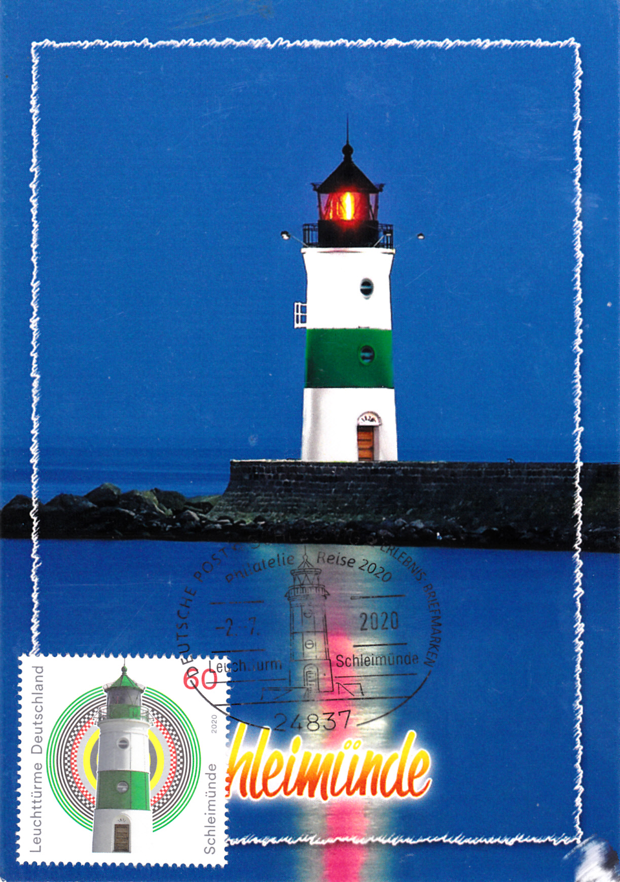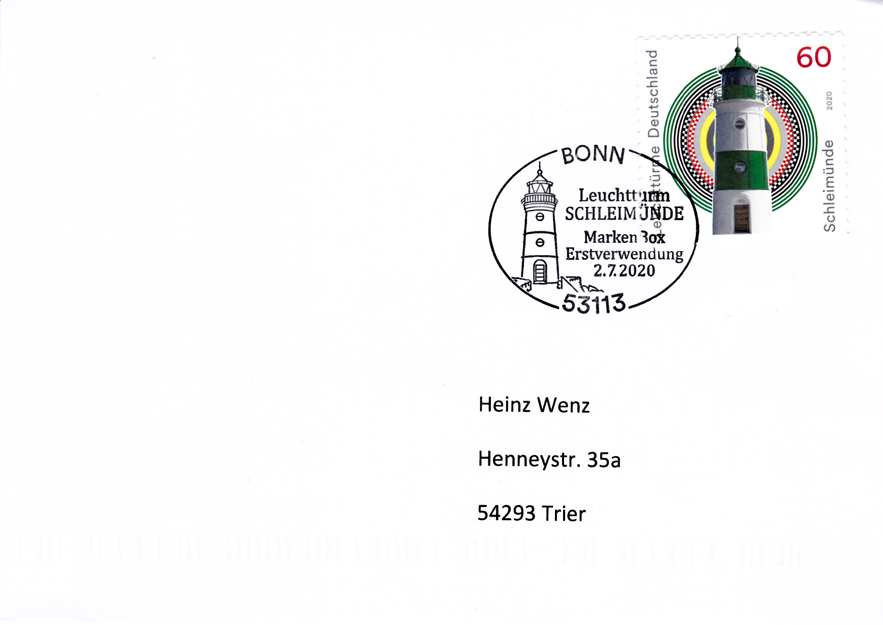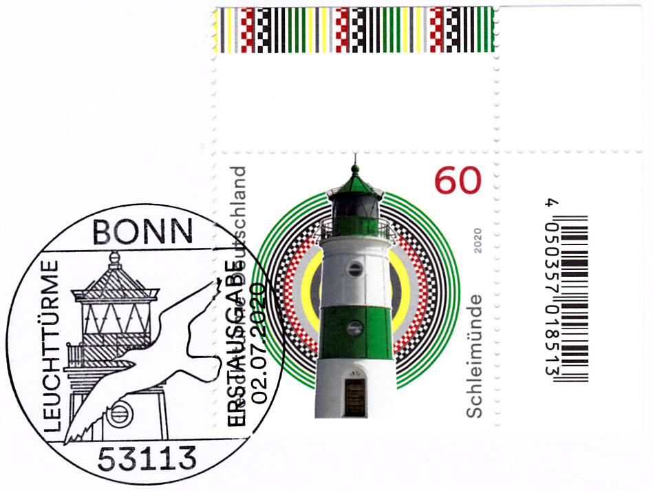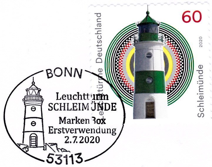 Auf diesem Brief ist die Marke mit dem Leuchtturm Schleimünde mit dem Ersttagsonderstempel Berlin entwertet, die Marke zu 20 Cent wurde mit einem Tagesstempel der Stempelstelle Berlin entwertet.´