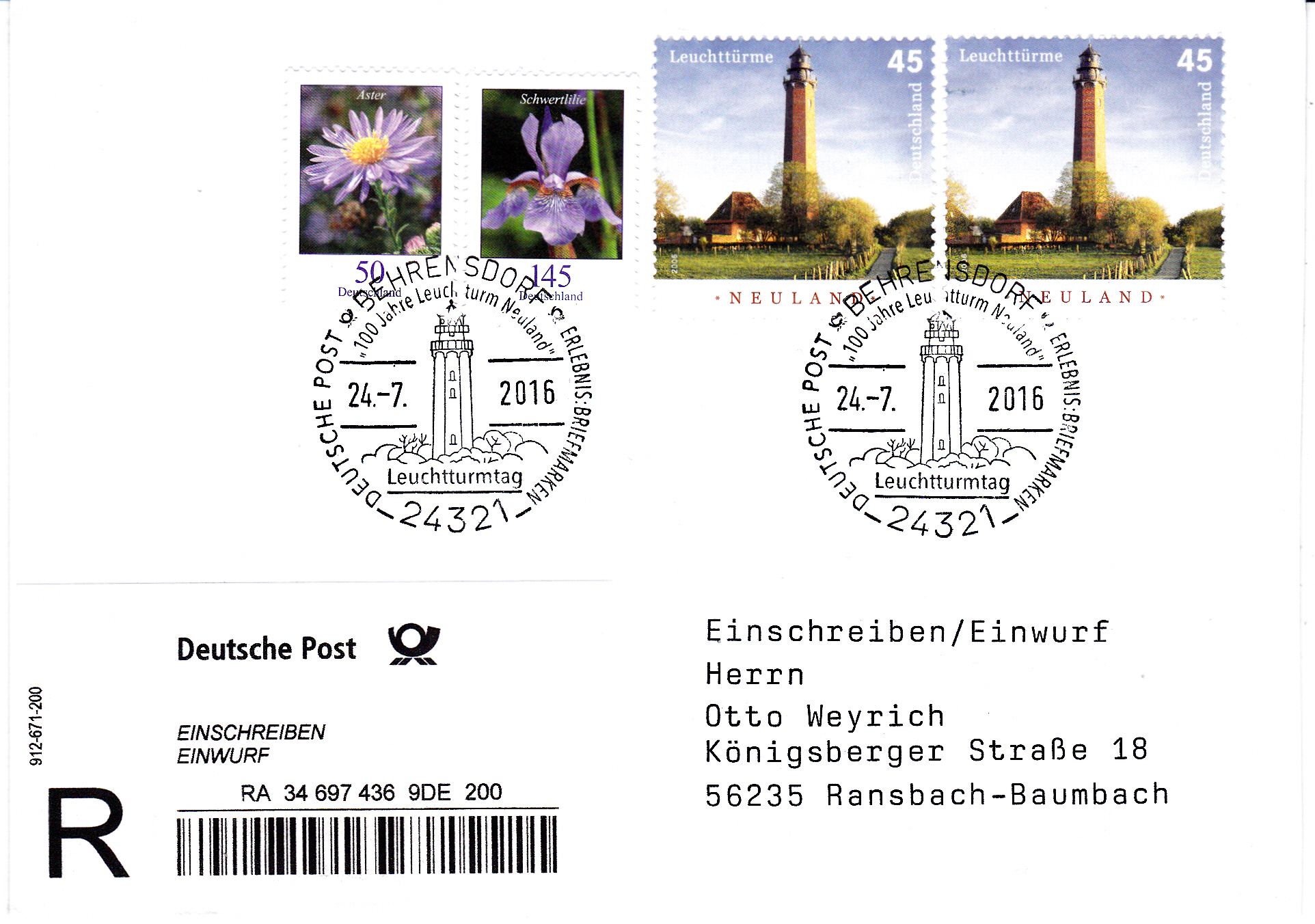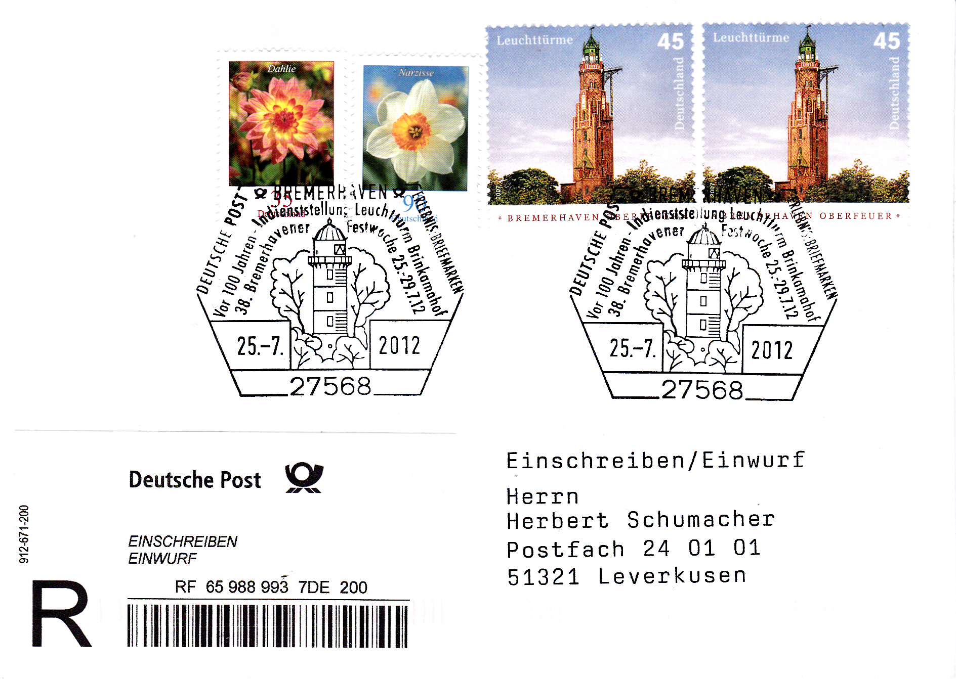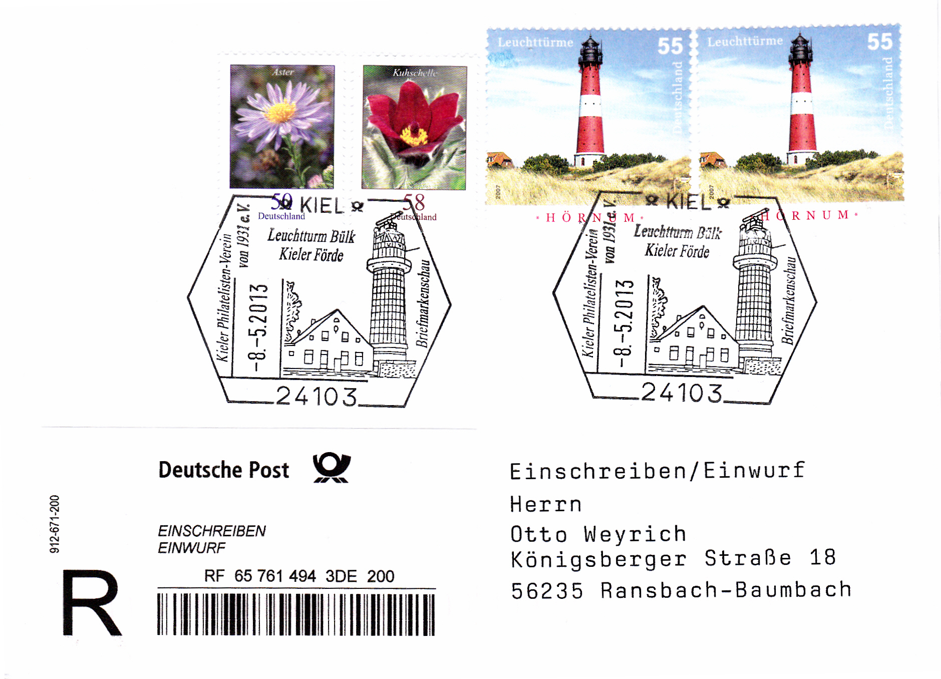 Einwurf-Einschreiben mit zwei Marken Leuchtturm Hörnum (MiNr 2613) und dem Sonderstempel vom 8.5.2013 aus Kiel mit einer Abbildung des Leuchtturmes Bülk in der Kieler Förde. Zur Frankaturergänzung sind noch zwei Marken der DS "Blumen" auf dem Brief verklebt worden.