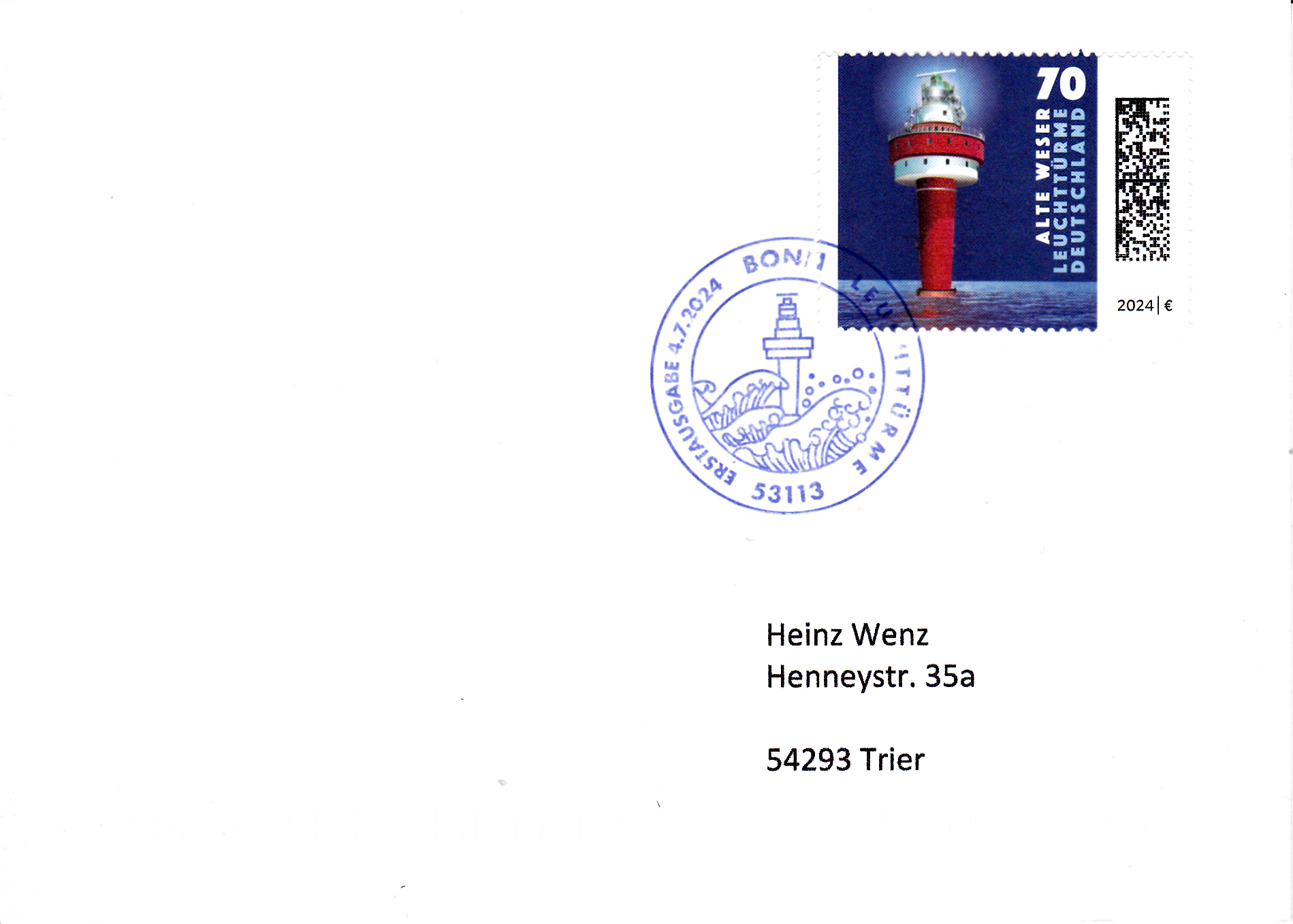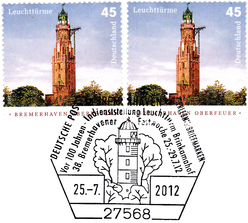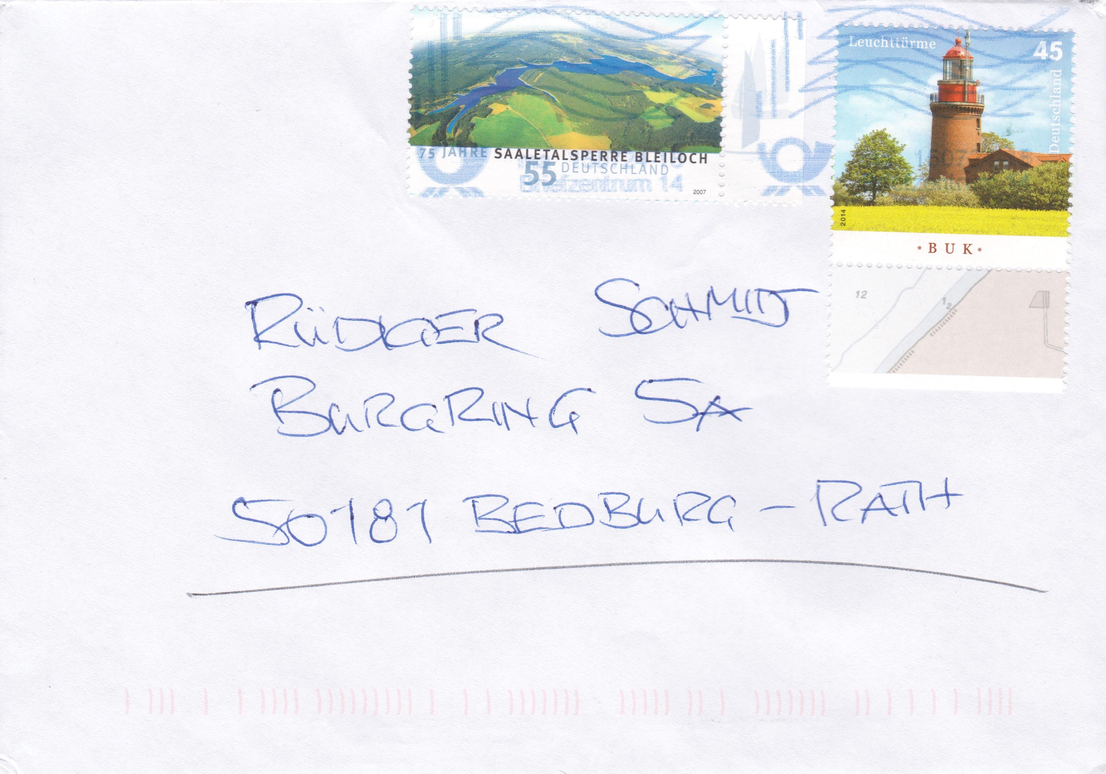 Einwurf-Einschreiben mit zwei Marken Leuchtturm Hörnum (MiNr 2613) und dem Sonderstempel vom 8.5.2013 aus Kiel mit einer Abbildung des Leuchtturmes Bülk in der Kieler Förde. Zur Frankaturergänzung sind noch zwei Marken der DS "Blumen" auf dem Brief verklebt worden.