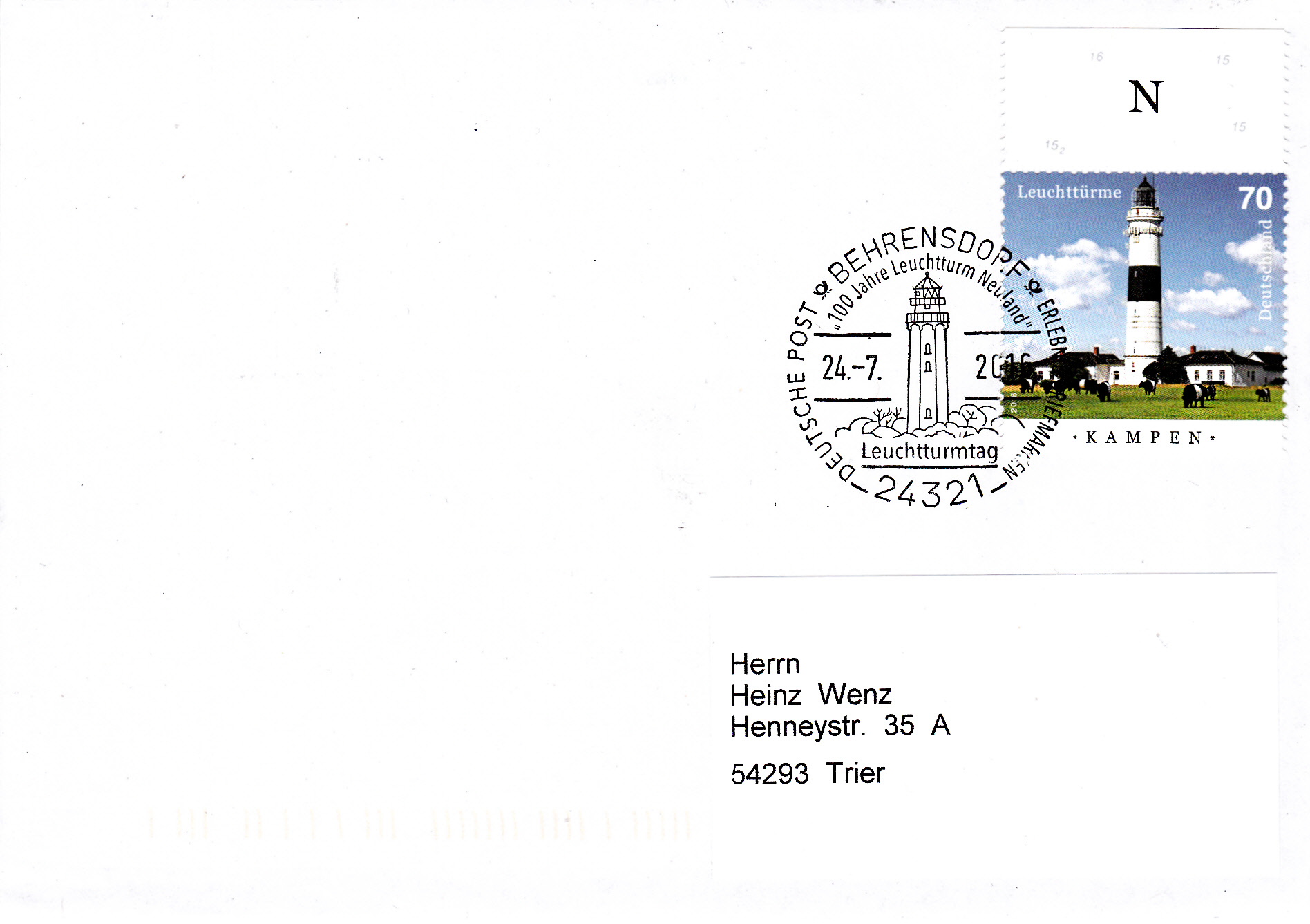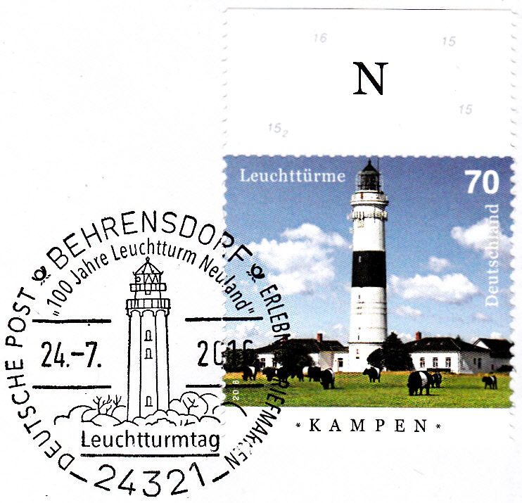 Der in einem früheren Beitrag bereits von Rüdiger vorgestellte Leuchtturm "Neuland", der auch auf der Marke MiNr 2555 abgebildet ist, wurde in den Jahren 1916/1916 erbaut. Er wurde also in 2016 100 Jahre alt. Am wurde aus diesem Anlass ein Leuchtturmtag veranstaltet. Dazu gab es einen Sonderstempel in Behrensdorf mit einer Abbildung des Leuchtturmes Neuland.