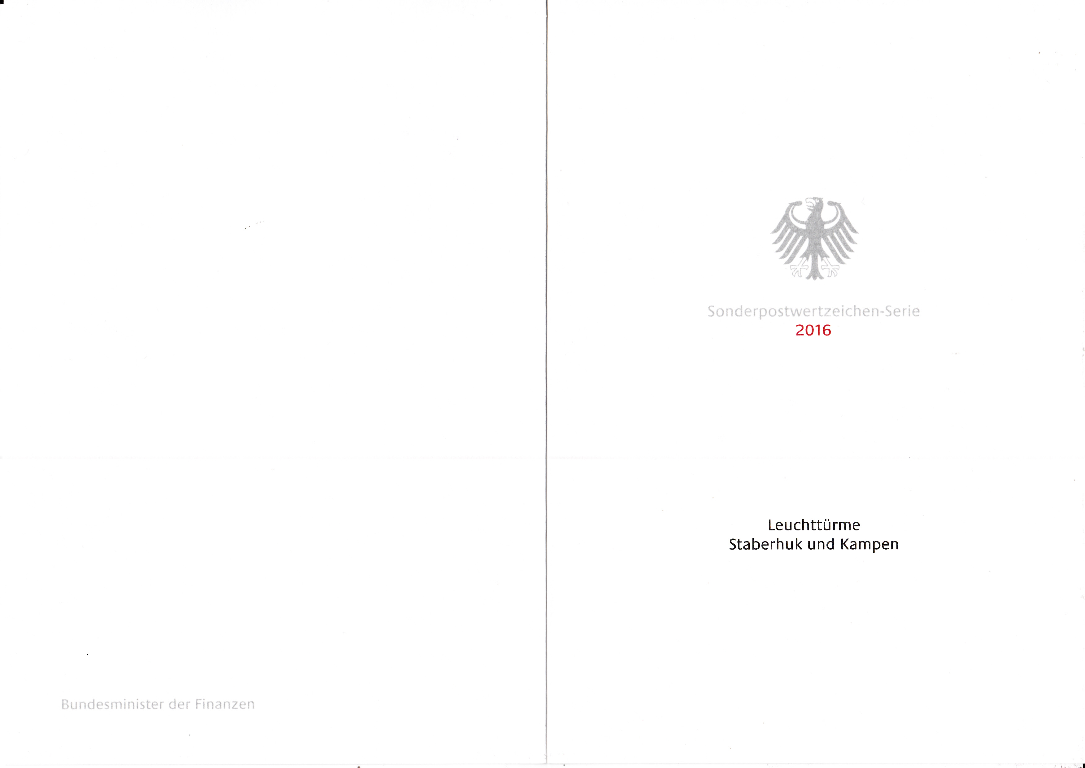 Ministerkarte des Finanzministers mit den beiden Leuchtturm-Marken des Jahres 2016 (MiNr 3252/3253), die die Leuchtürme Staberhuk und Kampen zeigen.