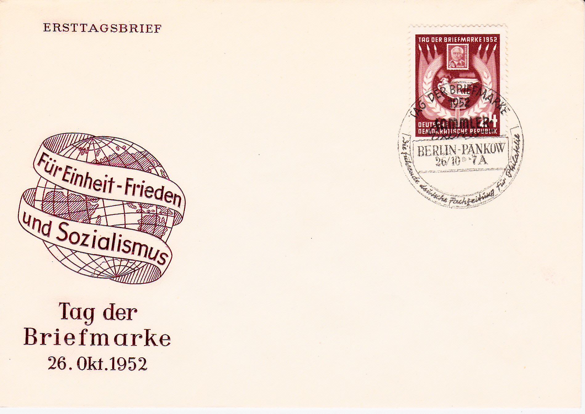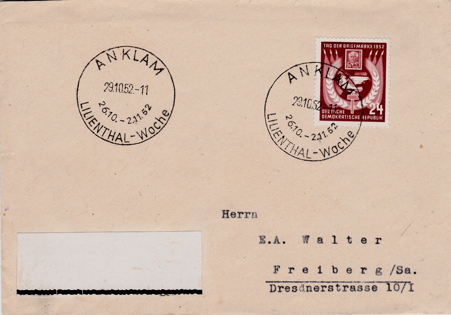 Einzelfrankatur der Marke zum Tag der Briefmarke 1952 auf einem Brief von Anklam nach Freiberg/Sachsen. Der Brief wurde mit einem Sonderstempel zur Lilienthal-Woche gestempelt.