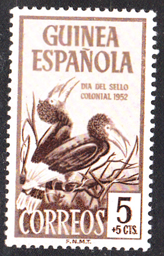 Zum Tag der Briefmarke 1952 erschien in den Spanische Besitzungen im Golf von Guinea eine Serie mit drei Marken mit der Abbildung zweier Weißschnabel-Hornvögel (Bycanistes cylindricus albutibialis).