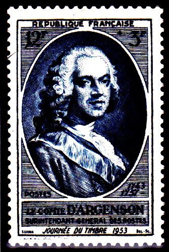 Am 14.3.1953 wurde in Frankreich eine Marke mit Zuschlag zum Tag der Briefmarke 1953 (MiNr 958) verausgabt. Die Marke bildet Graf d´Argenson (1696-1764) ab. Er war Generaloberintendant der Post unter Ludwig XV.
