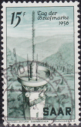 Im Saarland erschien am 6.5.1956 zum Tag der Briefmarke 1956 diese Marke (MiNr 369) mit dem Fernmeldeturm in Saarbrücken.